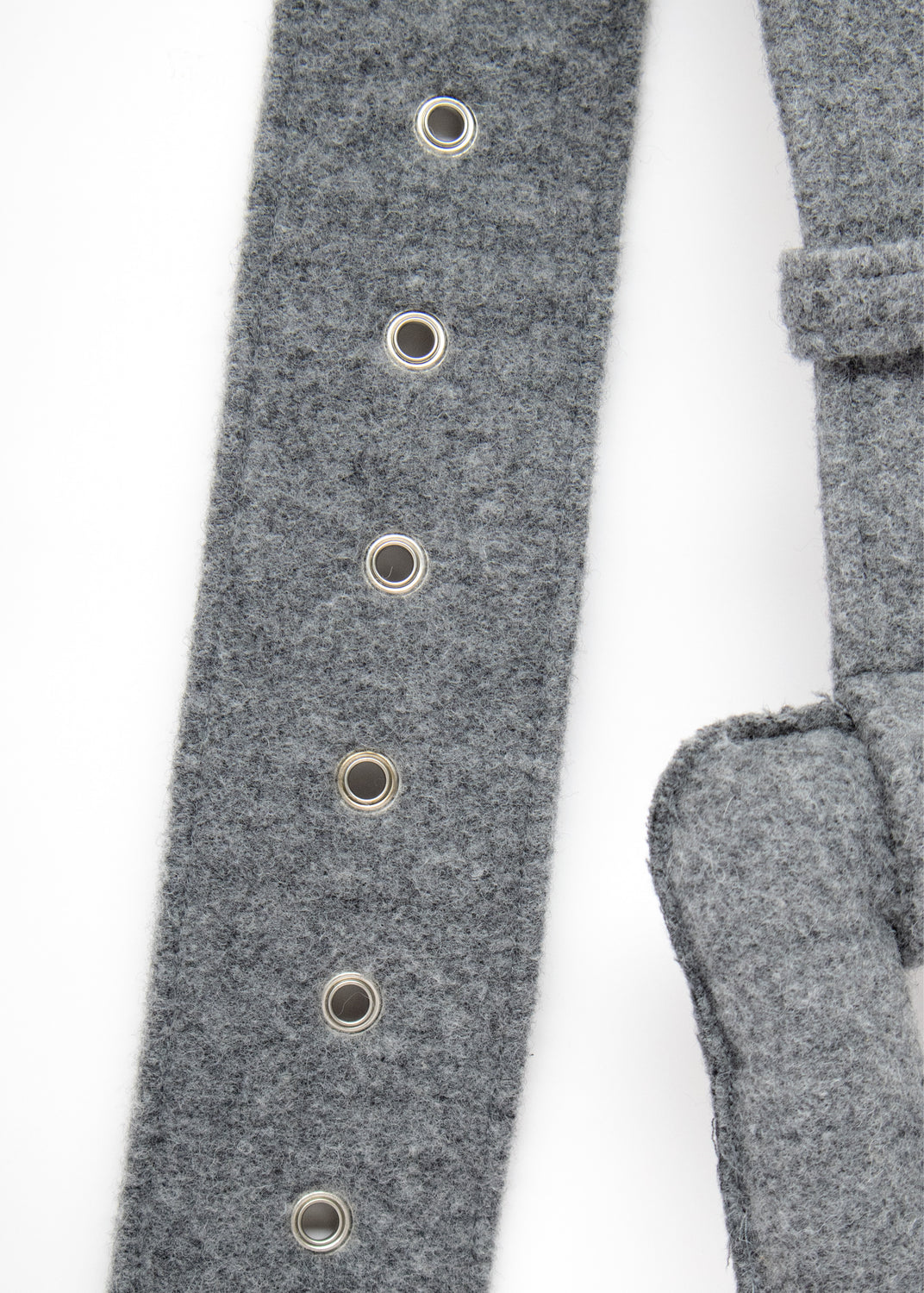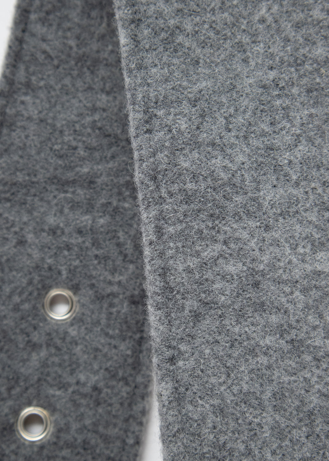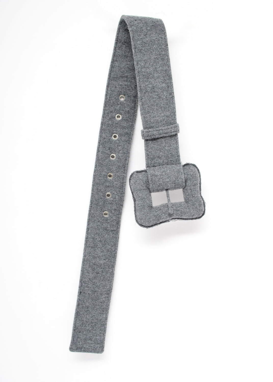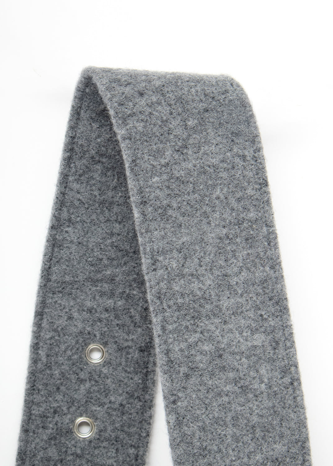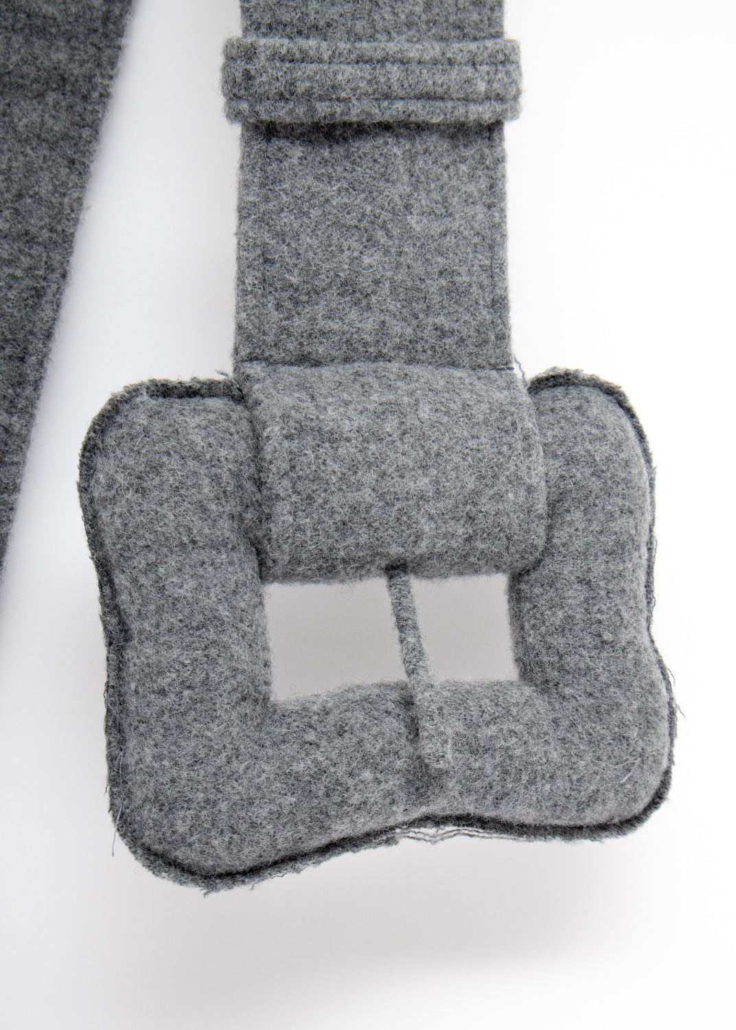 Made in grey melange double-face wool, the soft raw-cut buckle is fully padded and secured onto a long wide belt strap with silver-tone eyelets. Wear it over wide-leg trousers or layer atop coats in the wintertime.