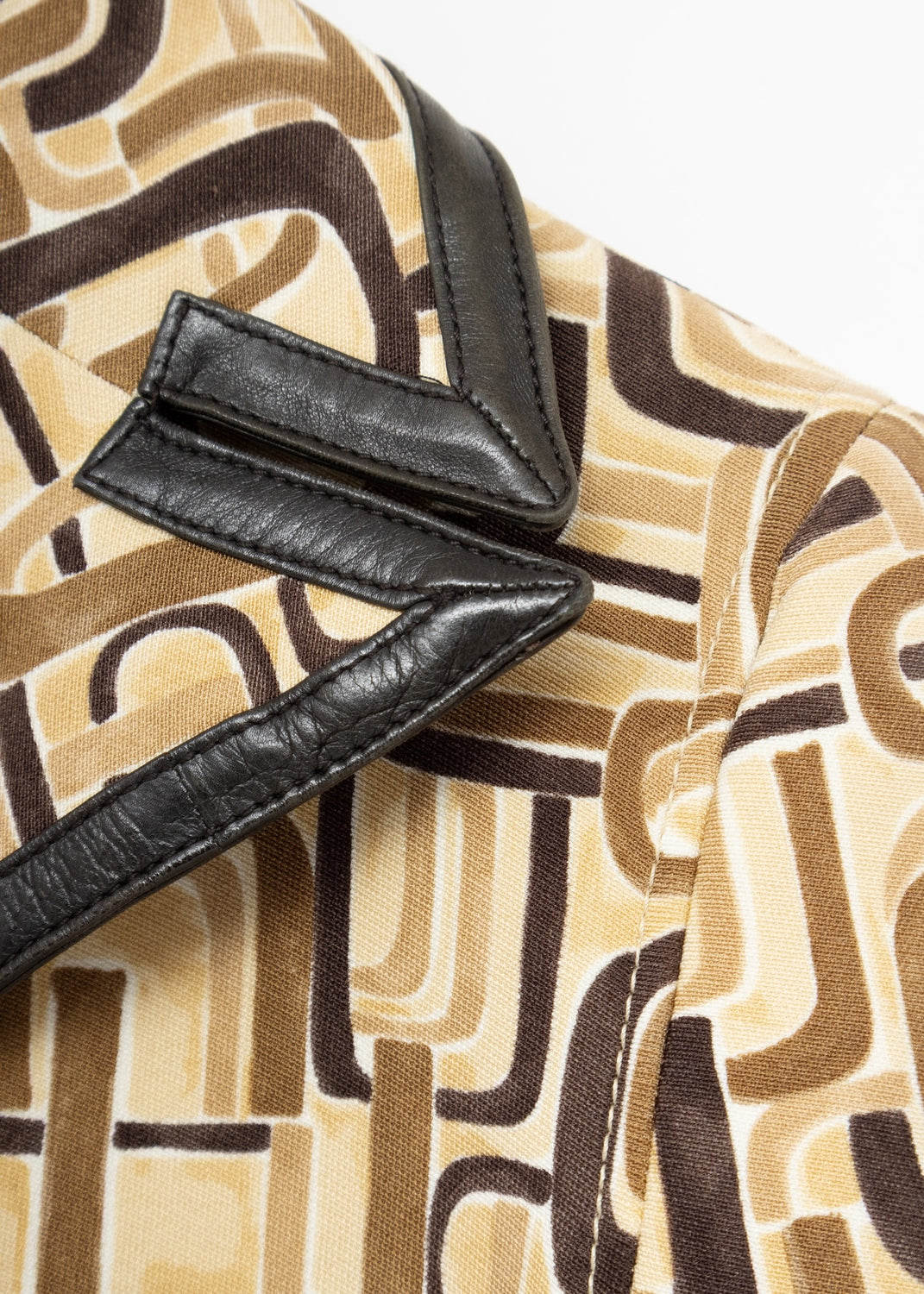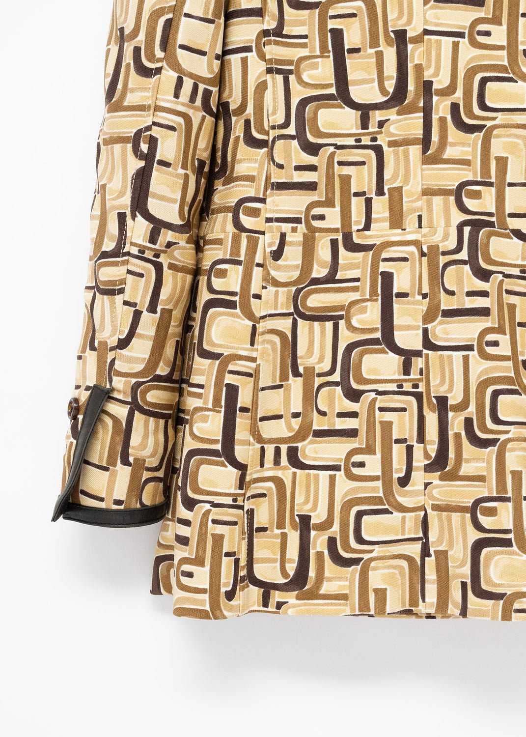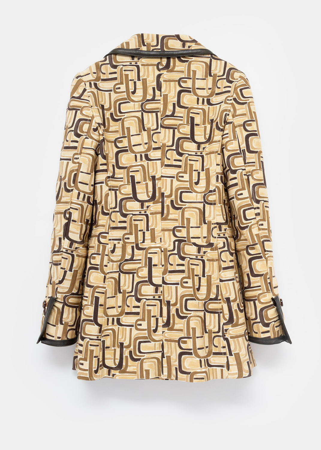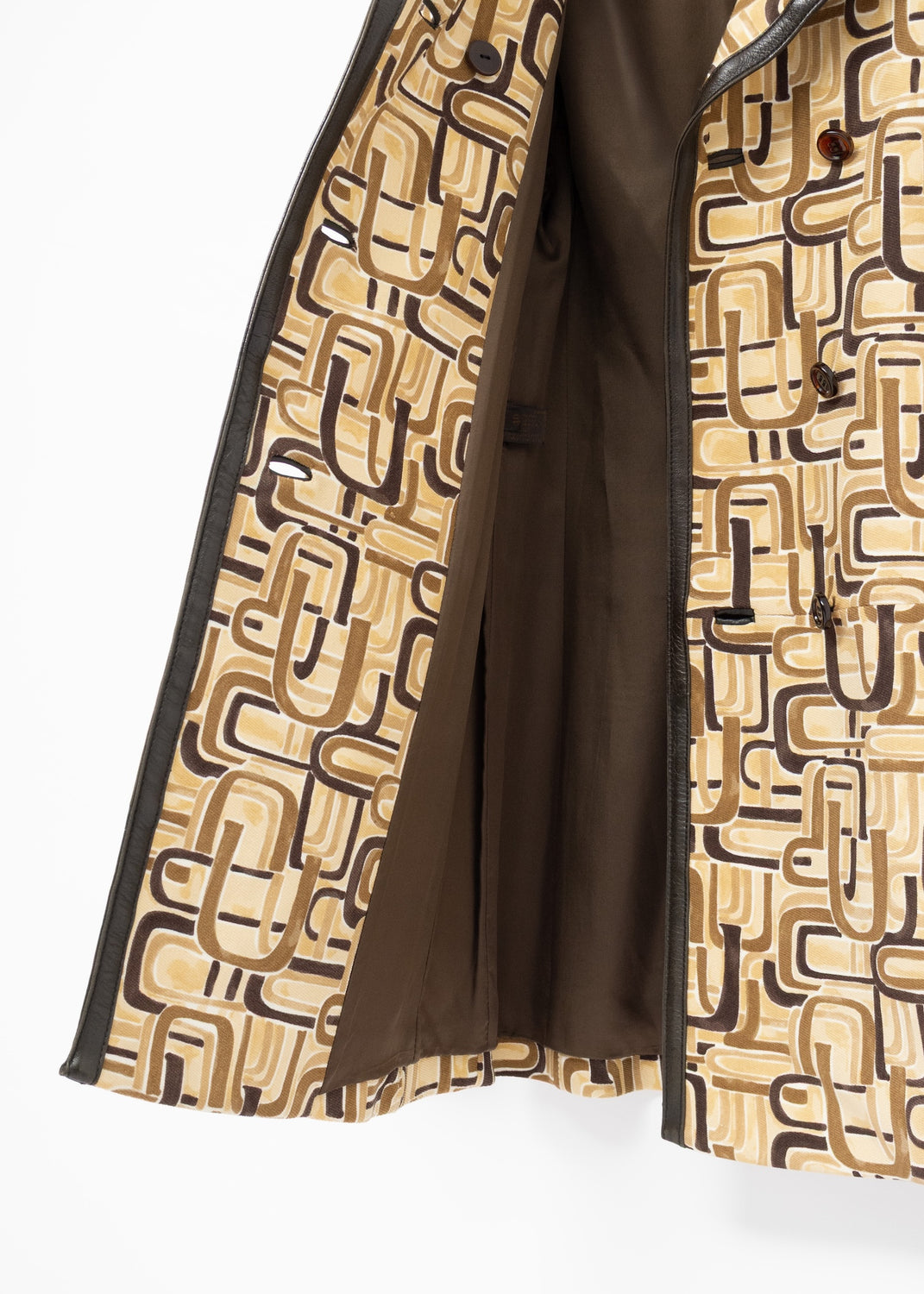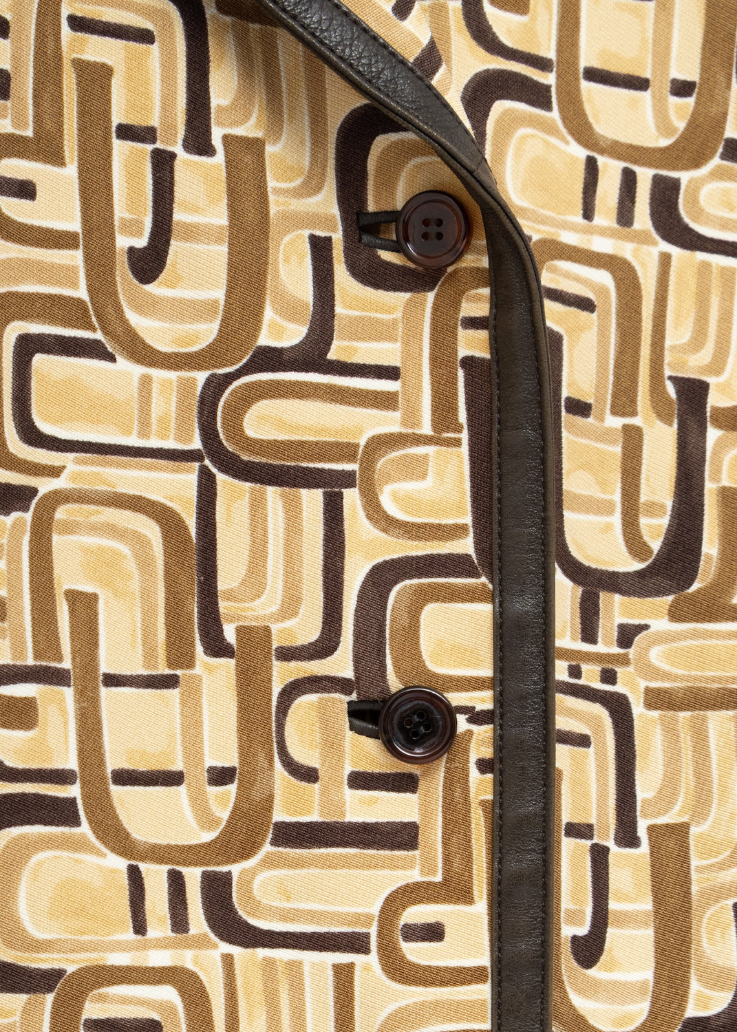 What defines the coat is its all-over U-motif print, a recurring graphic in the collection. The print’s interlocking forms are hand-drawn in colored marker, in varying shades of brown, camel and yellow. Leather trim on the collar, cuffs, and buttonholes adds subtle contrast in texture and protects the edges from wear and tear.