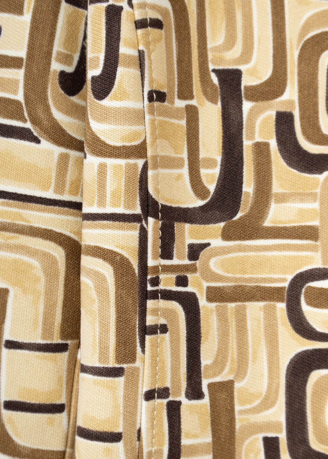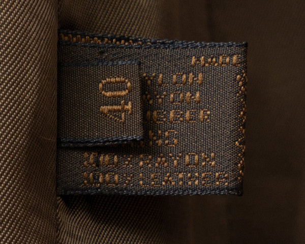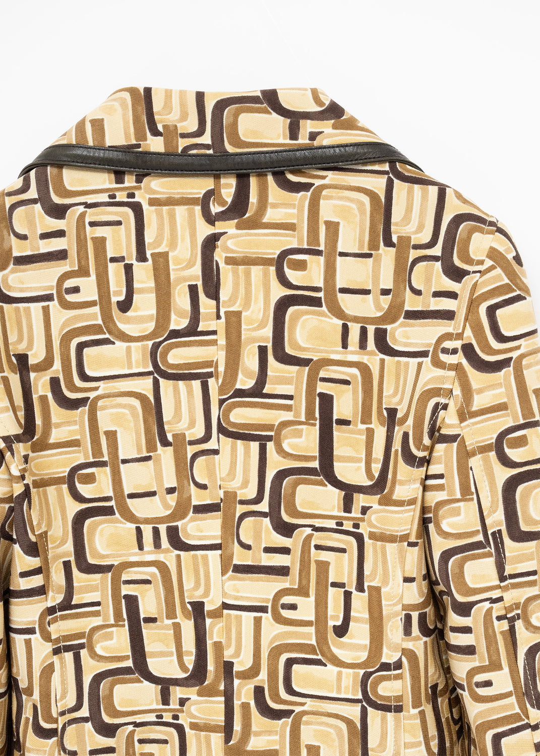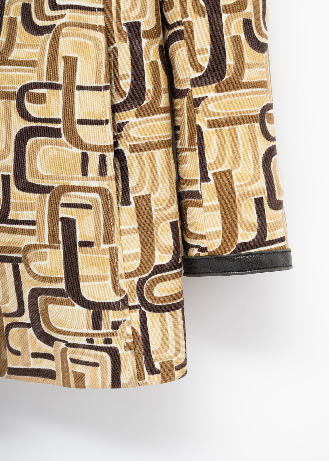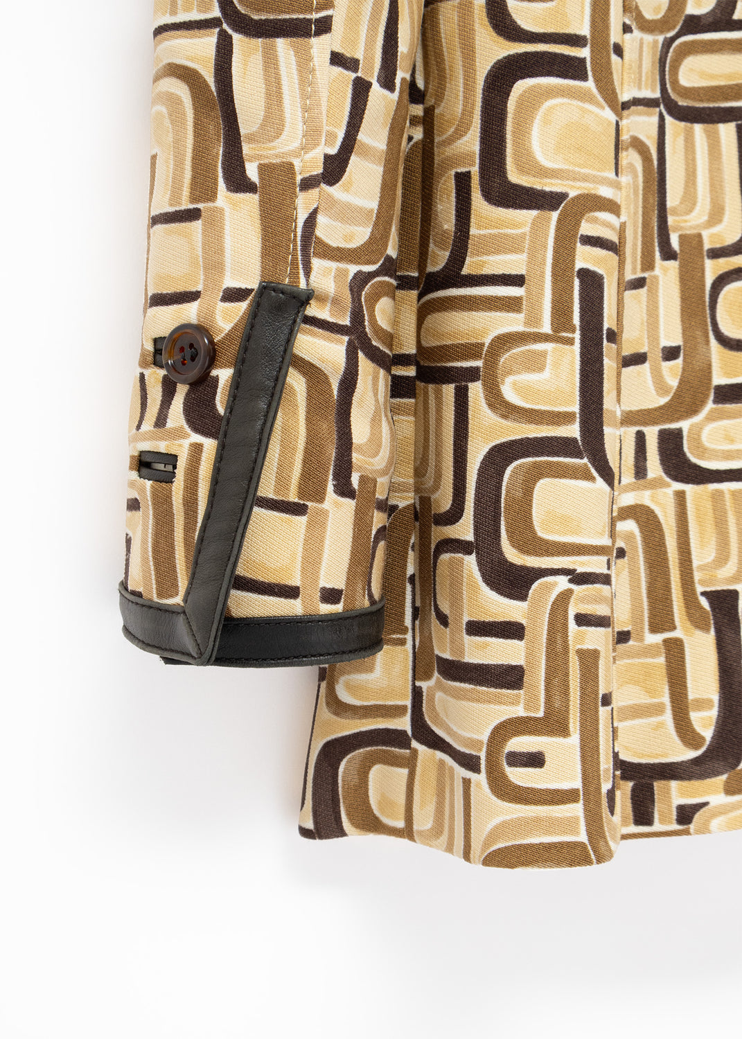 What defines the coat is its all-over U-motif print, a recurring graphic in the collection. The print’s interlocking forms are hand-drawn in colored marker, in varying shades of brown, camel and yellow. Leather trim on the collar, cuffs, and buttonholes adds subtle contrast in texture and protects the edges from wear and tear.