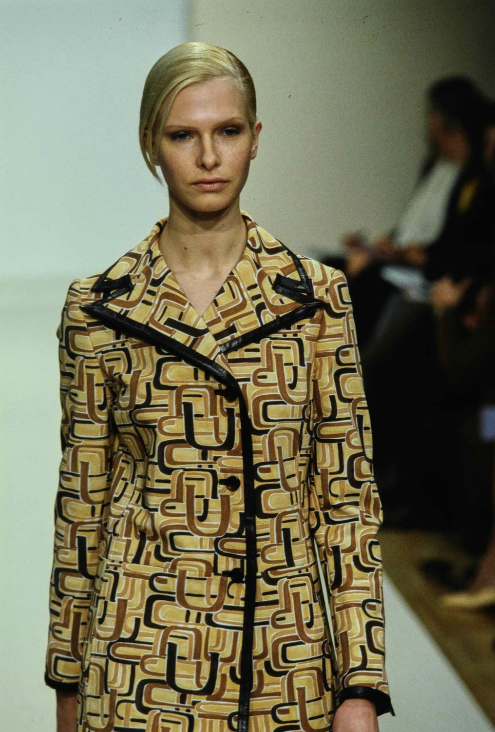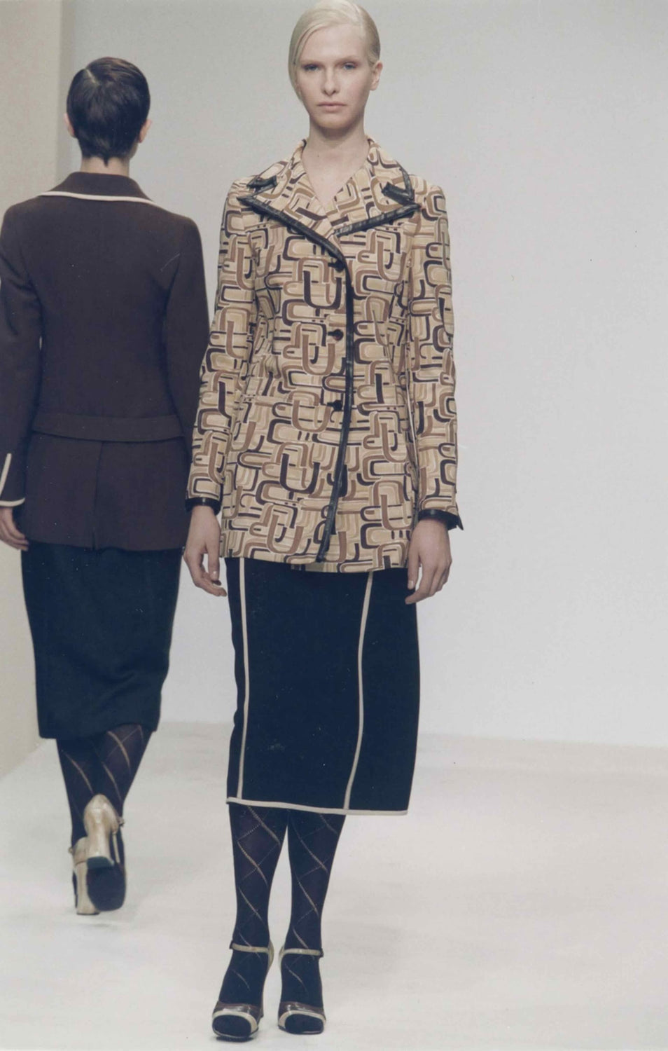 Prada’s Fall/Winter 1996 seemed much in conversation with the now-iconic “ugly chic” collection that preceded it, taking a similar approach of using restrained, archetypal silhouettes disrupted by an odd color palette and eccentric choices of print.