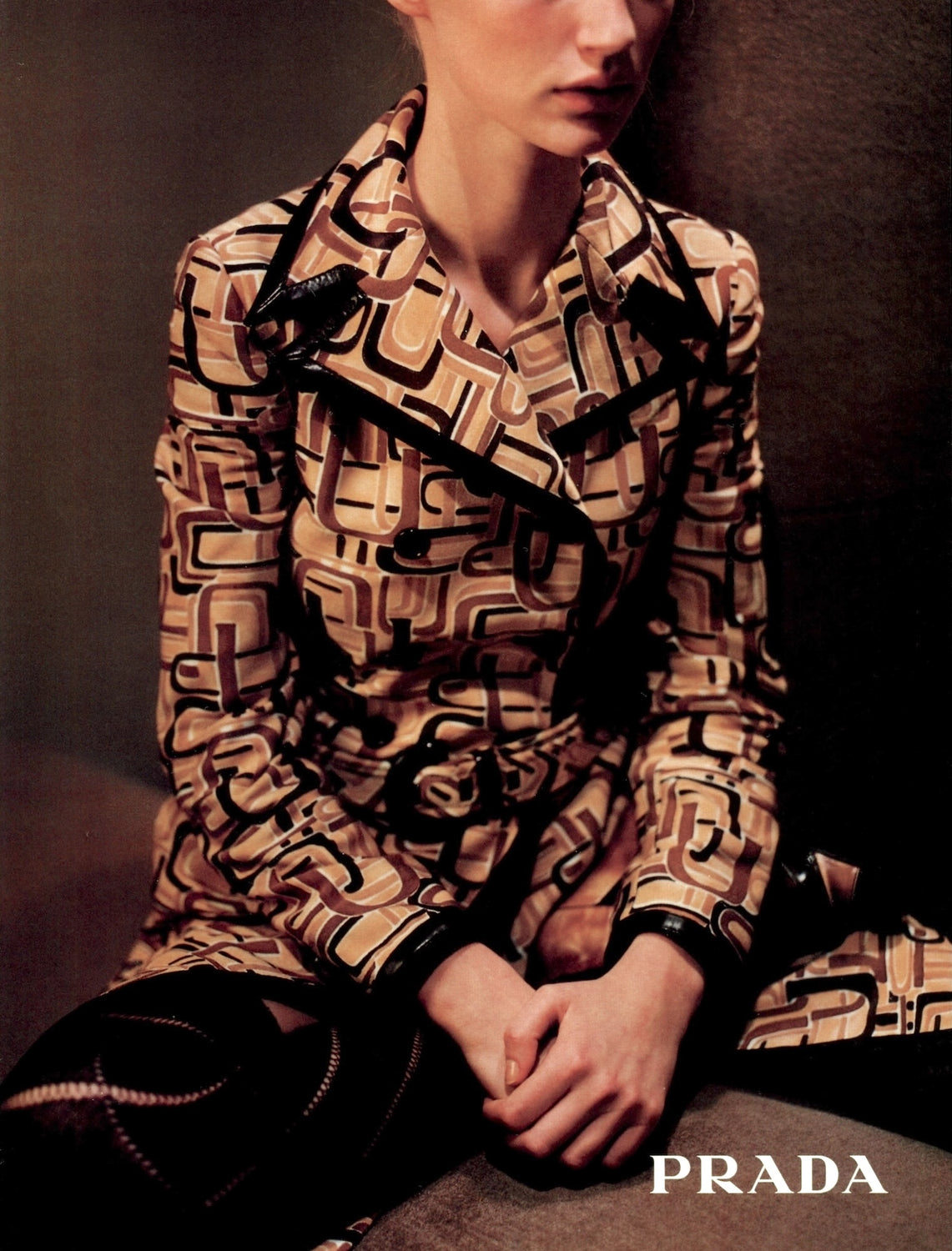 Model Esther de Jong wears the coat for Prada's Fall/Winter 1996 campaign by Glen Luchford.
