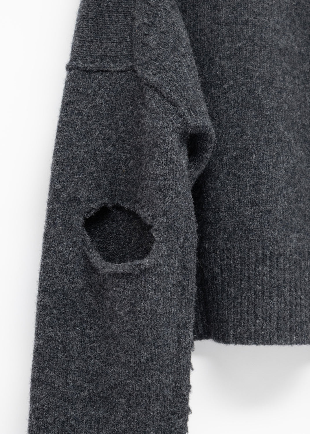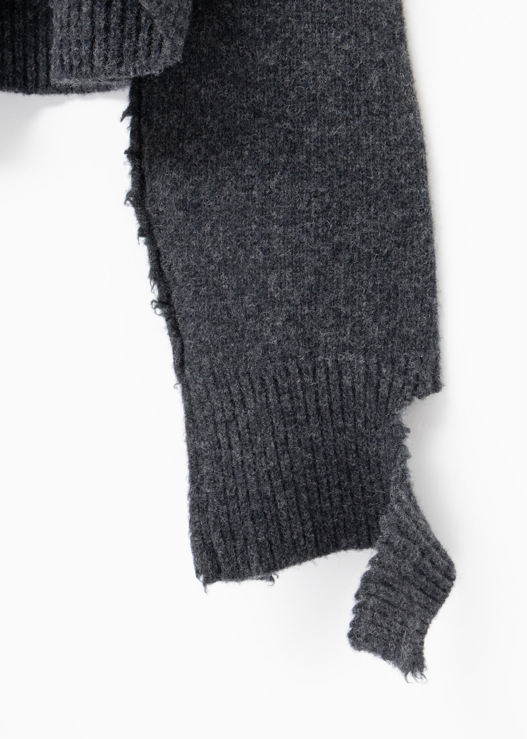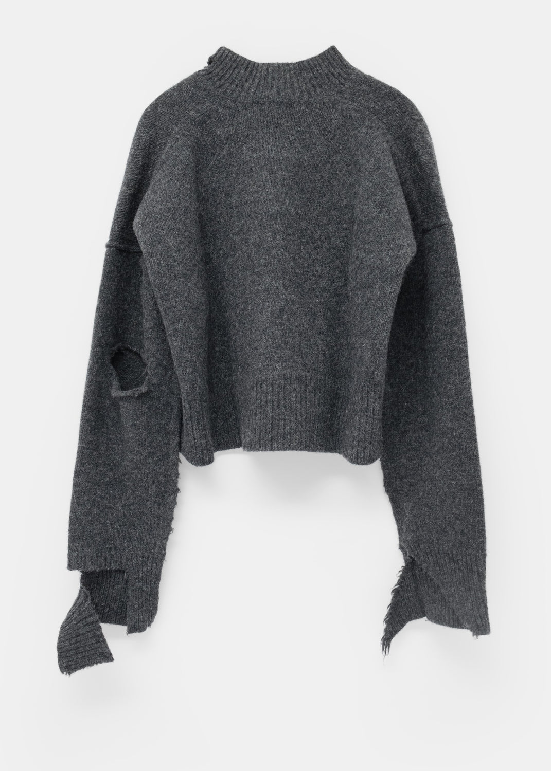 Ribbed cuff with ripped details; sleeve inseam is raw-cut