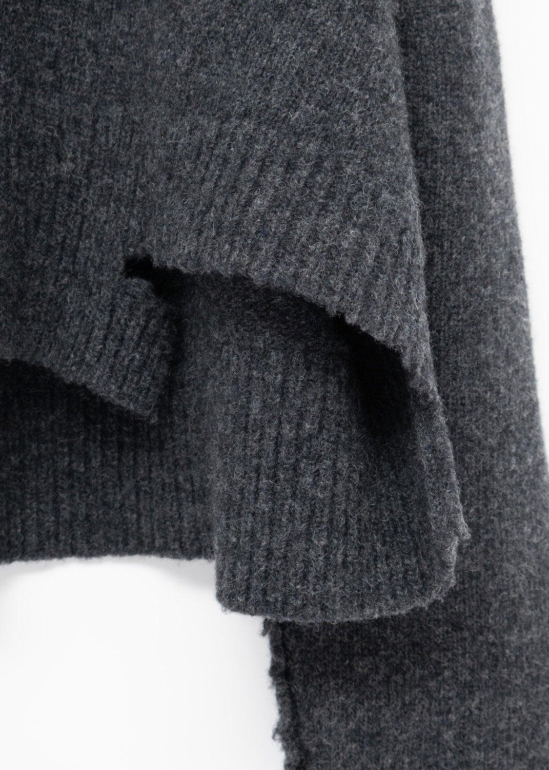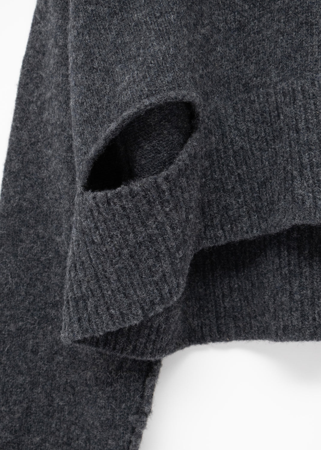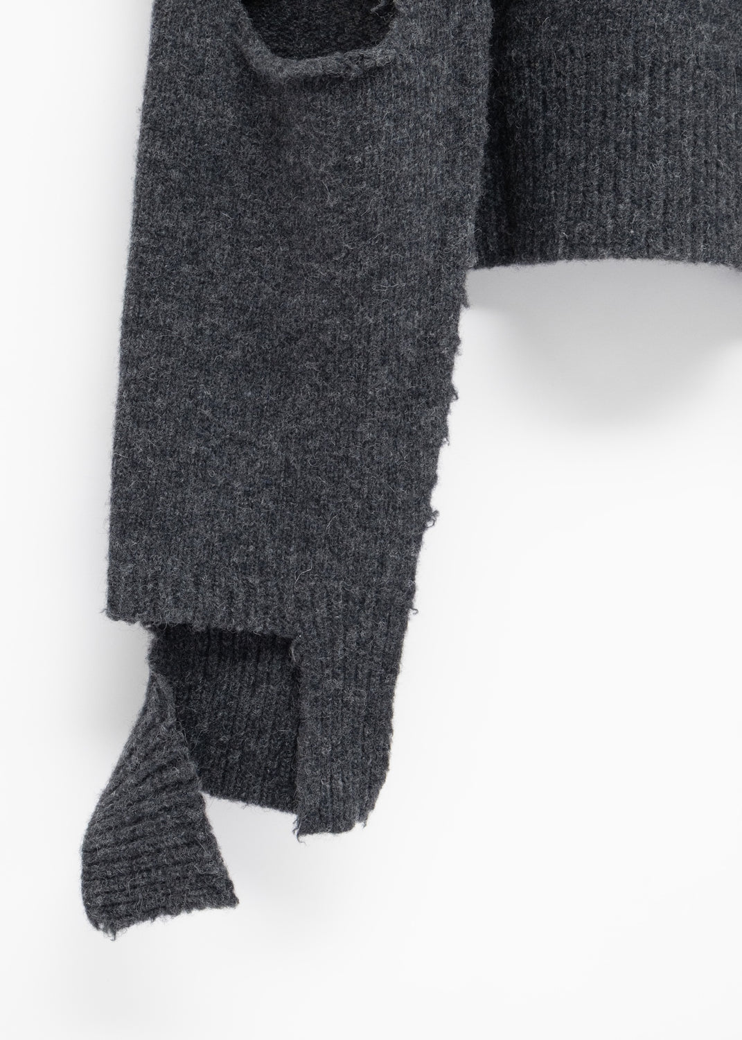 Ribbed cuff with ripped details; sleeve inseam is raw-cut