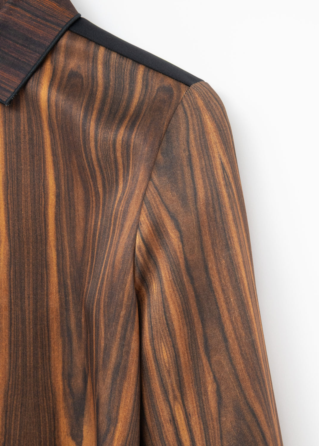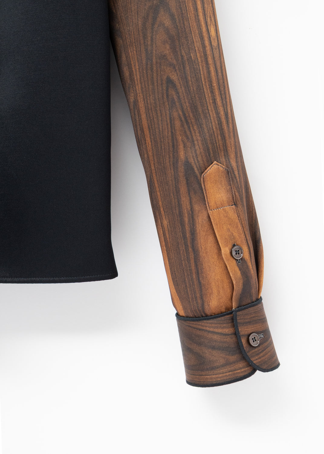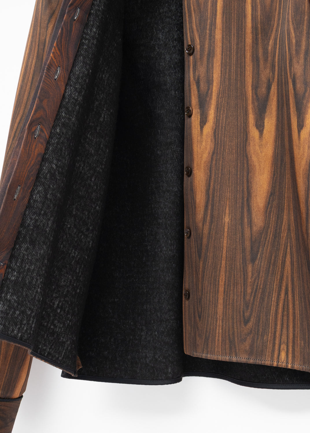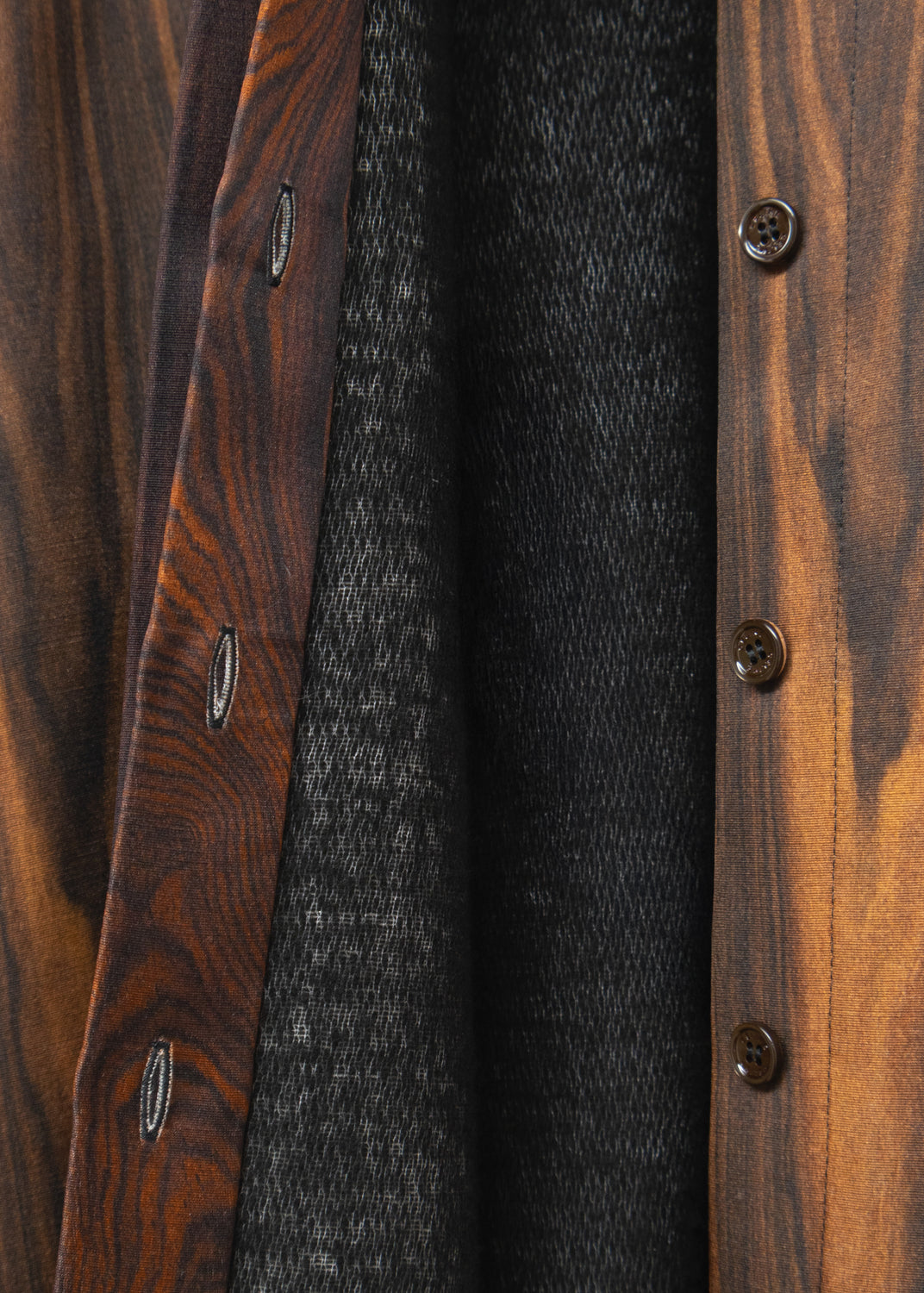 Cut to a regular fit, the shirt’s front and sleeves highlight the rich wood-grain print, while the pointed collar and concealed button placket use a slightly deeper variation. The back is cut from jet-black wool–silk for contrast. Inside, the shirt is bonded with a napped lining for comfort and warmth, with the edges satin-stitched in black thread.