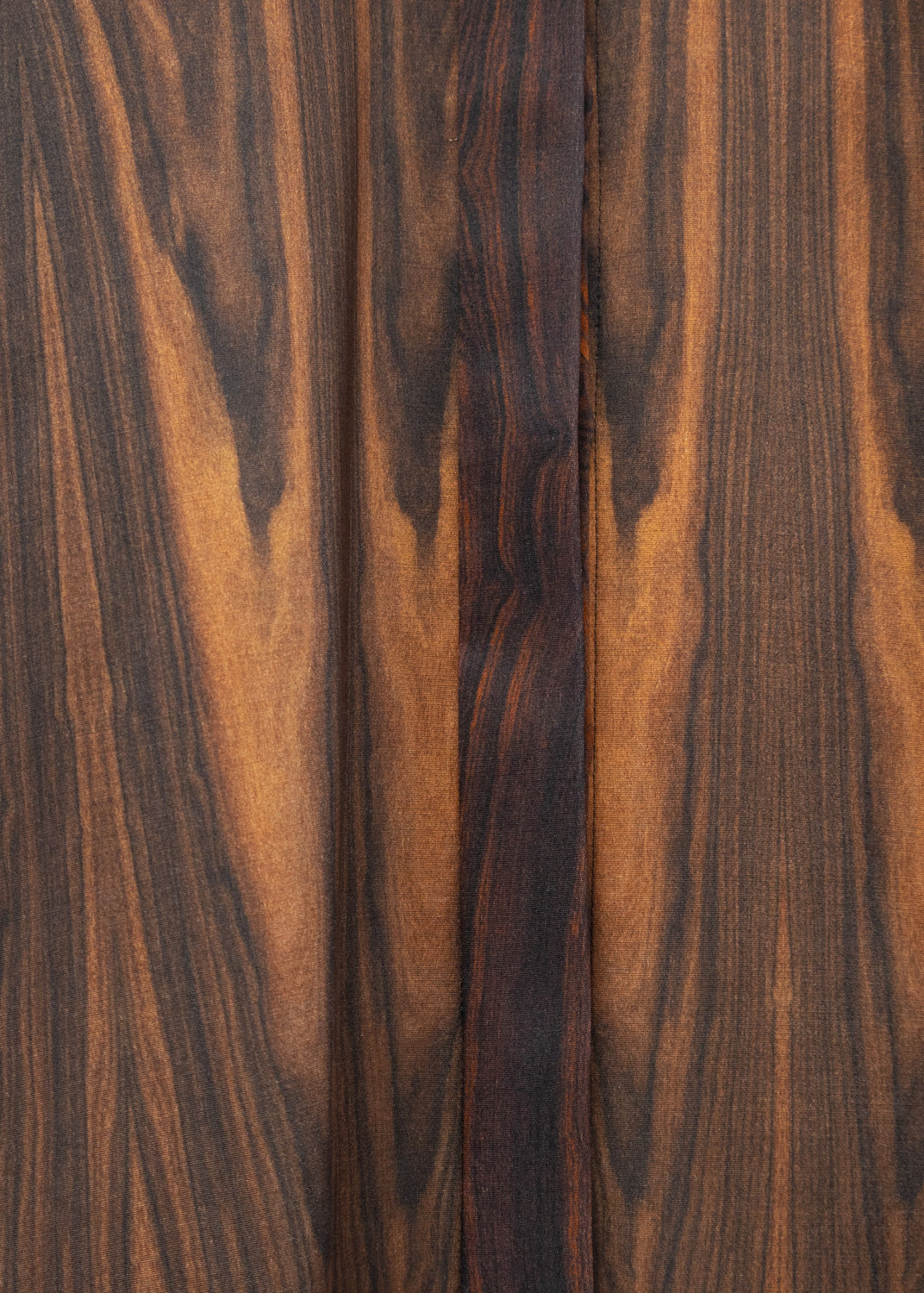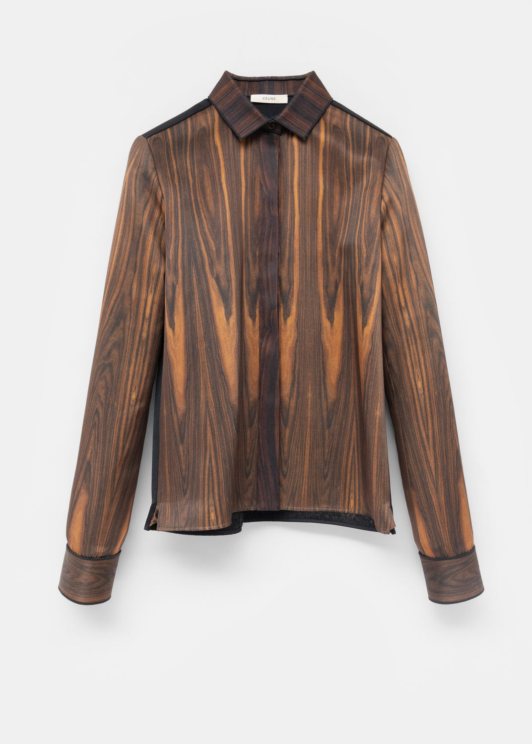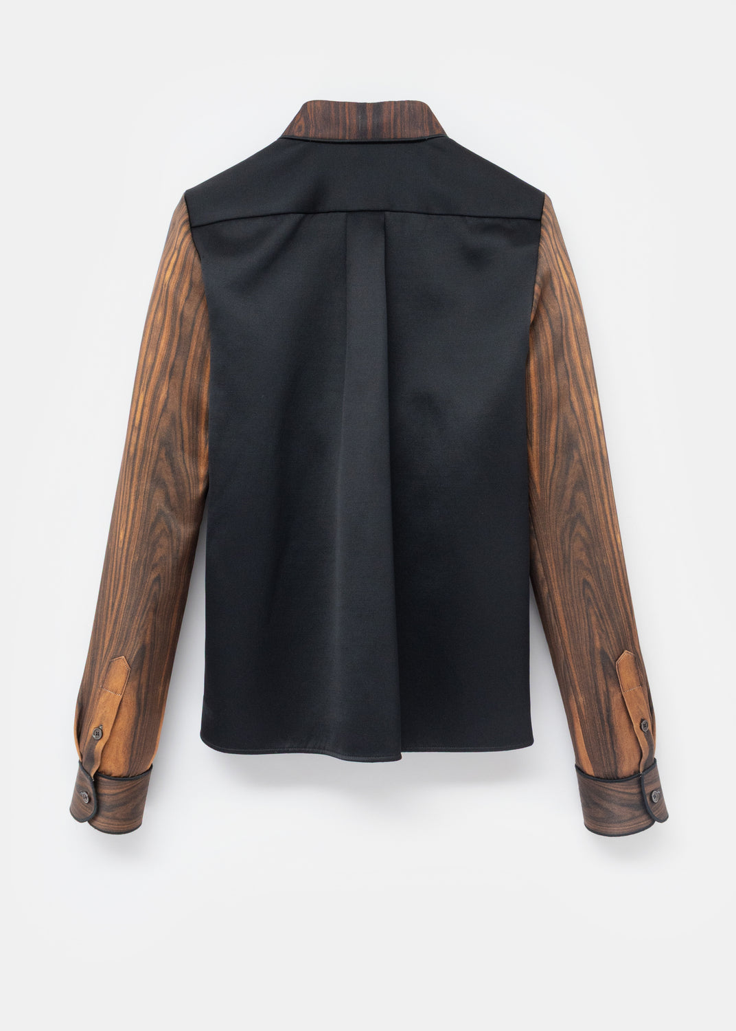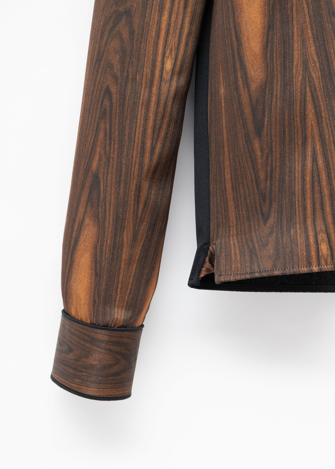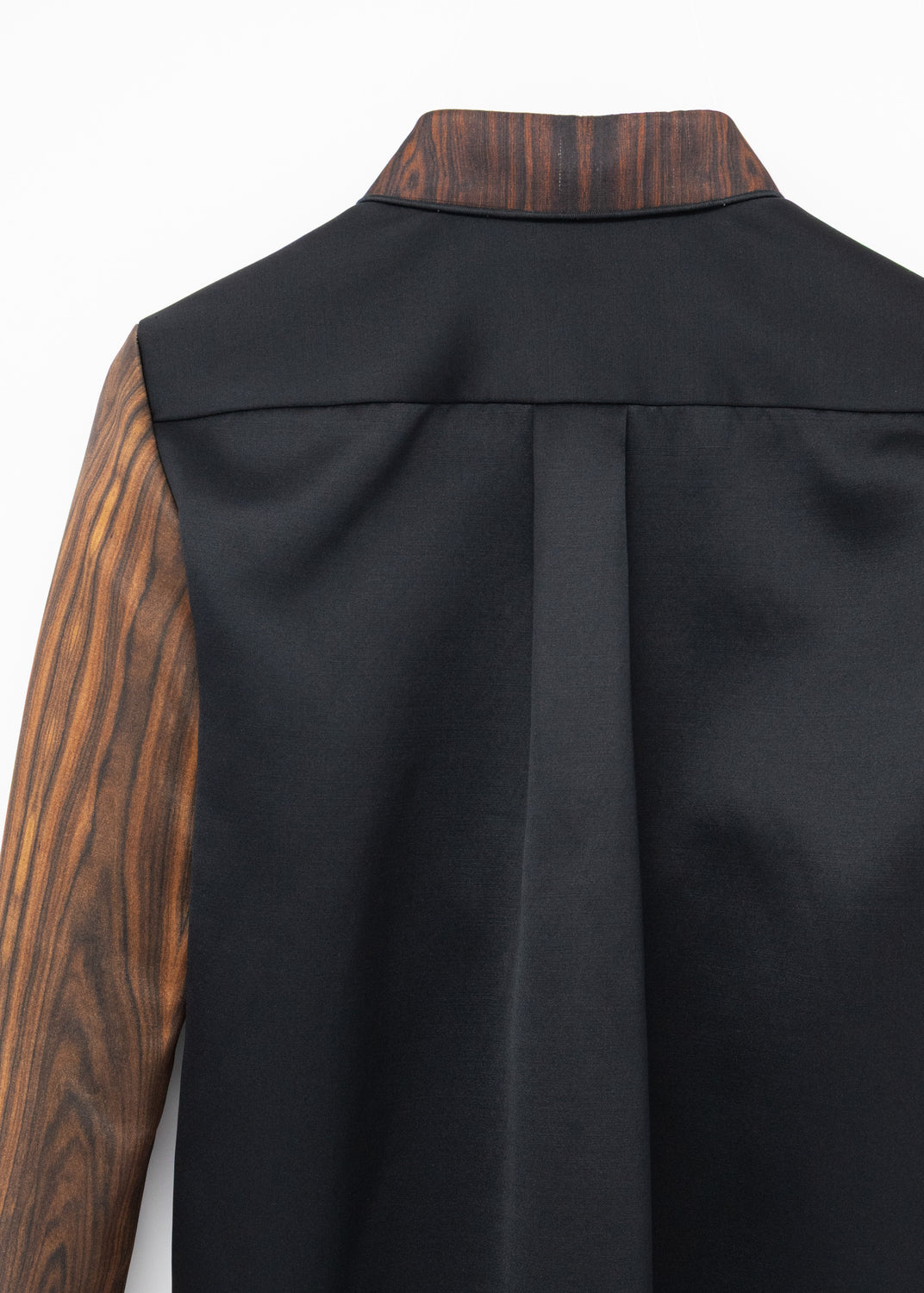 Cut to a regular fit, the shirt’s front and sleeves highlight the rich wood-grain print, while the pointed collar and concealed button placket use a slightly deeper variation. The back is cut from jet-black wool–silk for contrast. Inside, the shirt is bonded with a napped lining for comfort and warmth, with the edges satin-stitched in black thread.