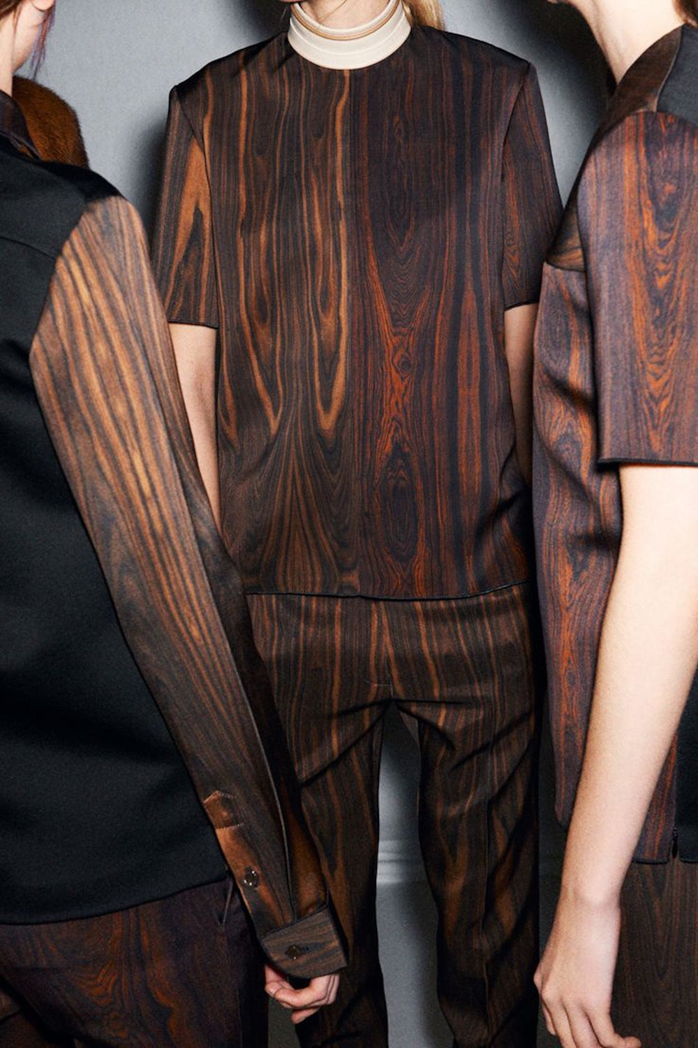 Models in woodgrain print garments backstage at the Celine Fall/Winter 2011 womenswear show in Paris