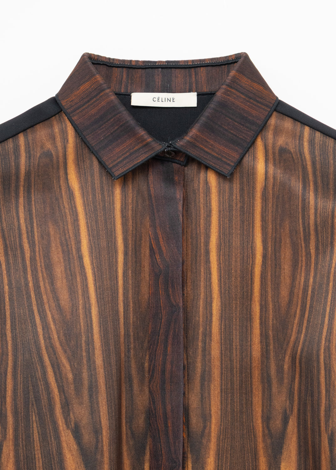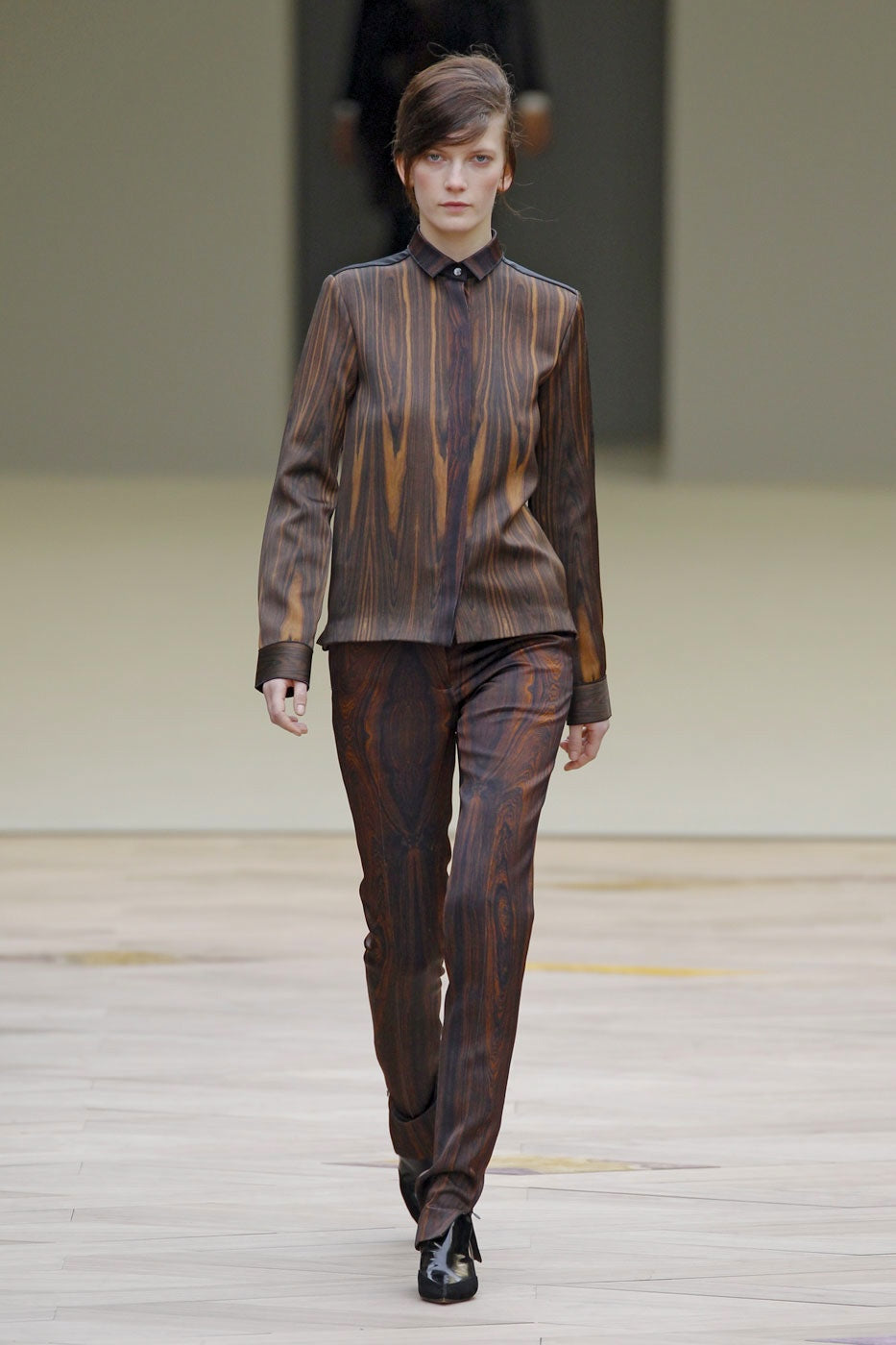 On her approach, she tells fashion critic Suzy Menkes: “Streamlined and reduced—and a lot of interiors of cars.” The wood- and leather-clad interiors were translated into motifs in the ready-to-wear. A series of separates, including this button-up shirt, featured a deep brown wood grain—the only print shown on the runway that season—echoing lacquered wooden dashboards of vintage automobiles.