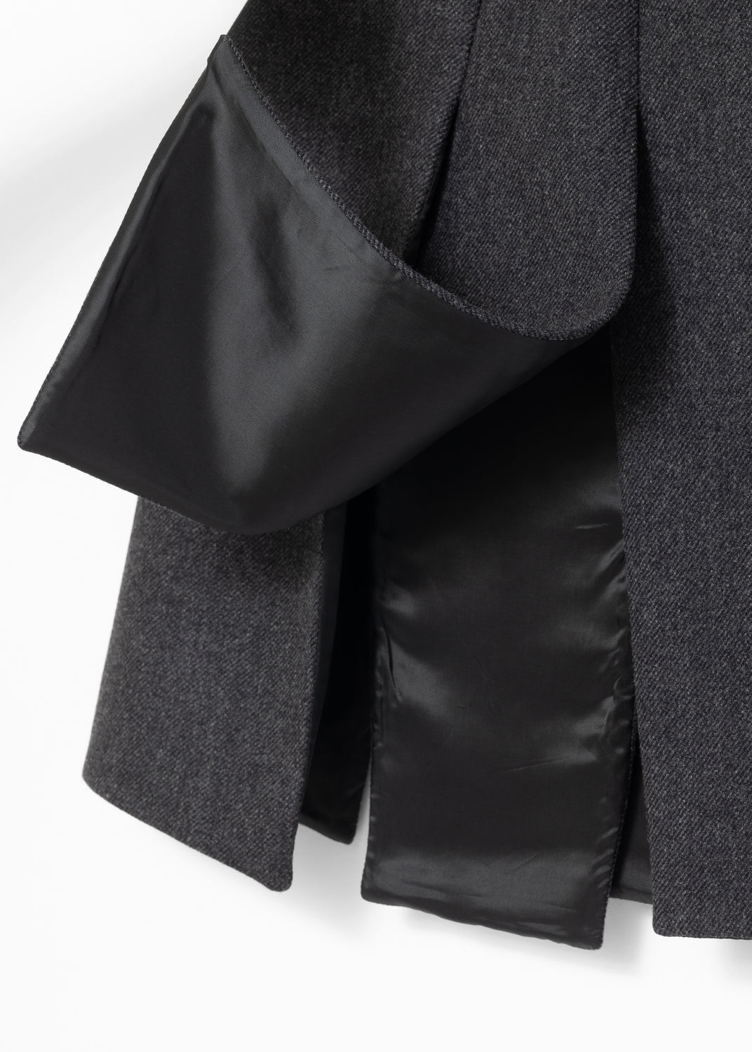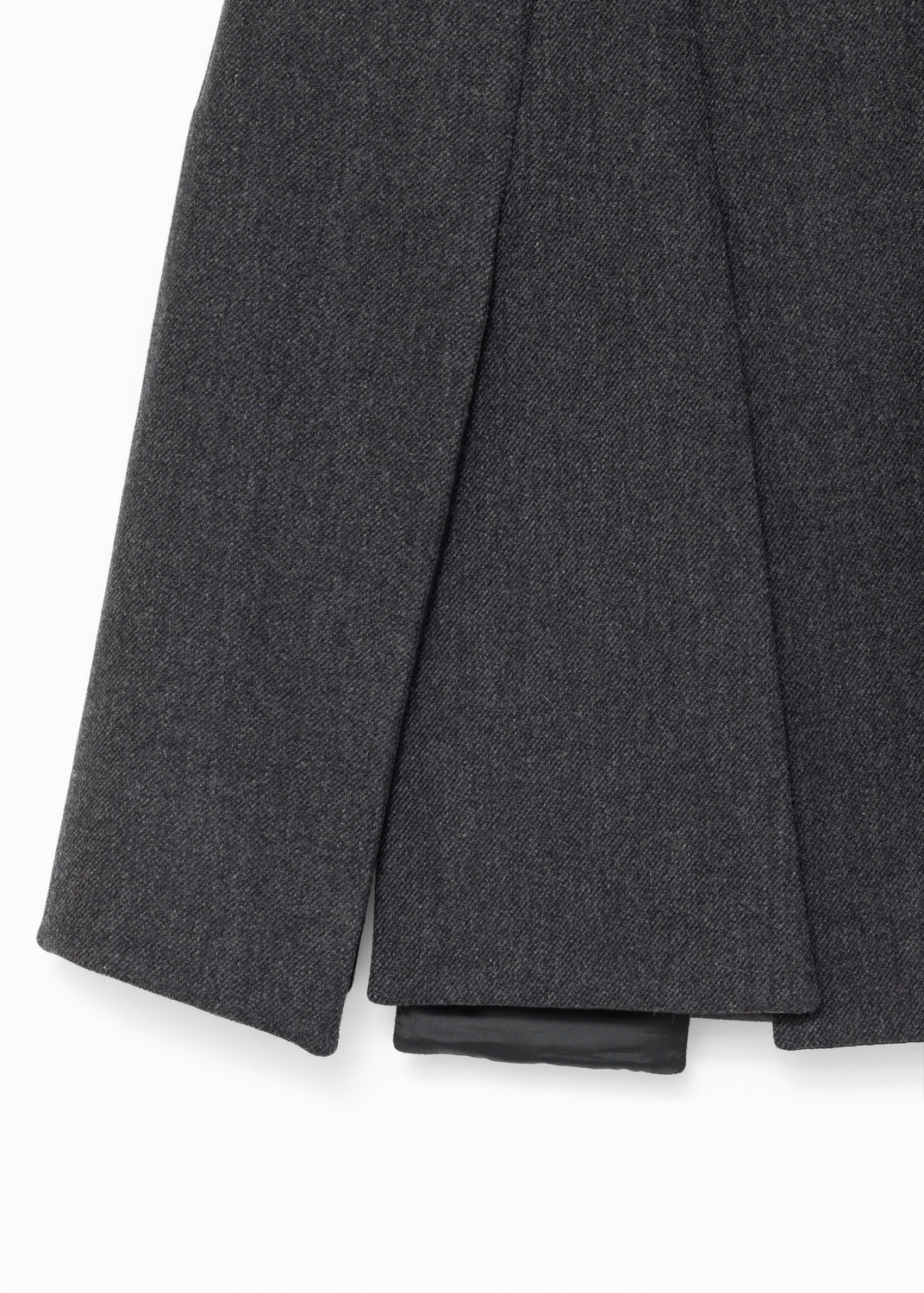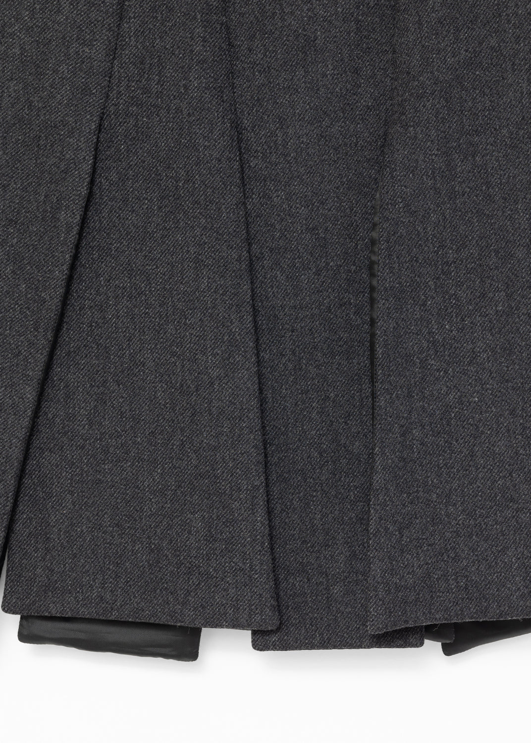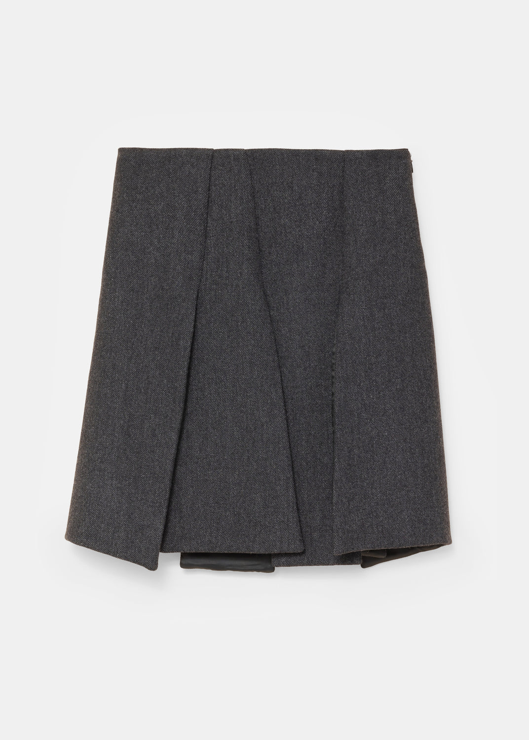 The skirt consists of rectangular panels that overlap at the waist, and split open at the legs, like deconstructed pleats. In movement, the panels work independently and reveal the legs with each stride.