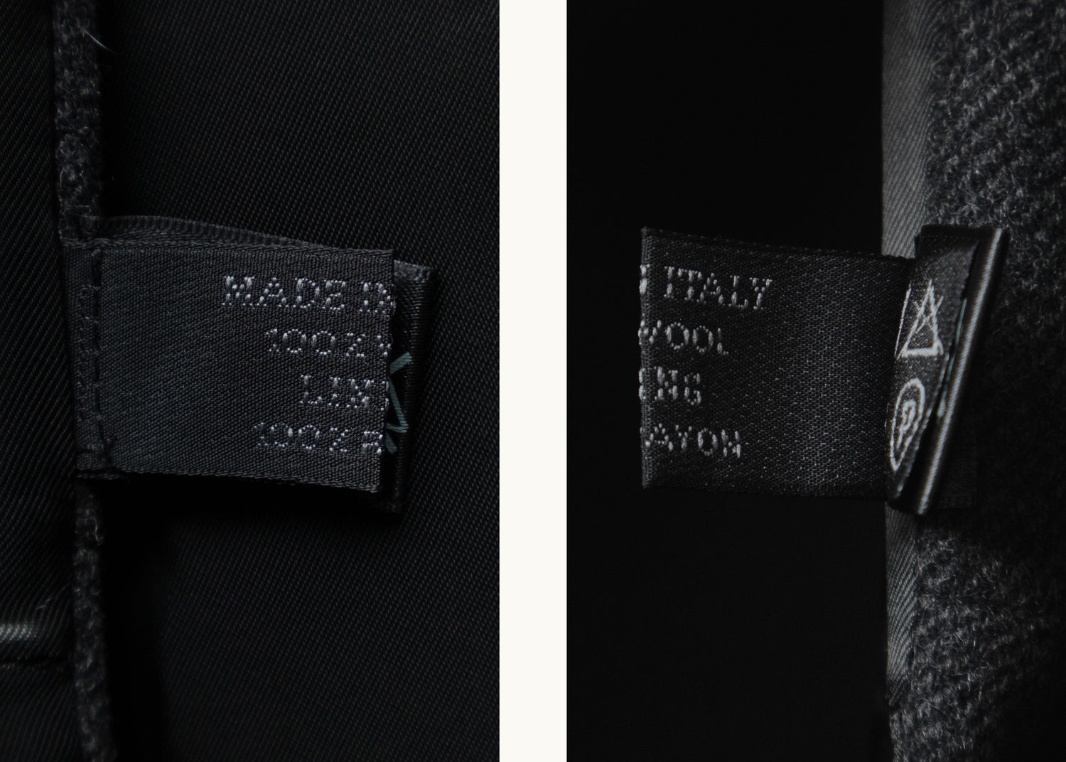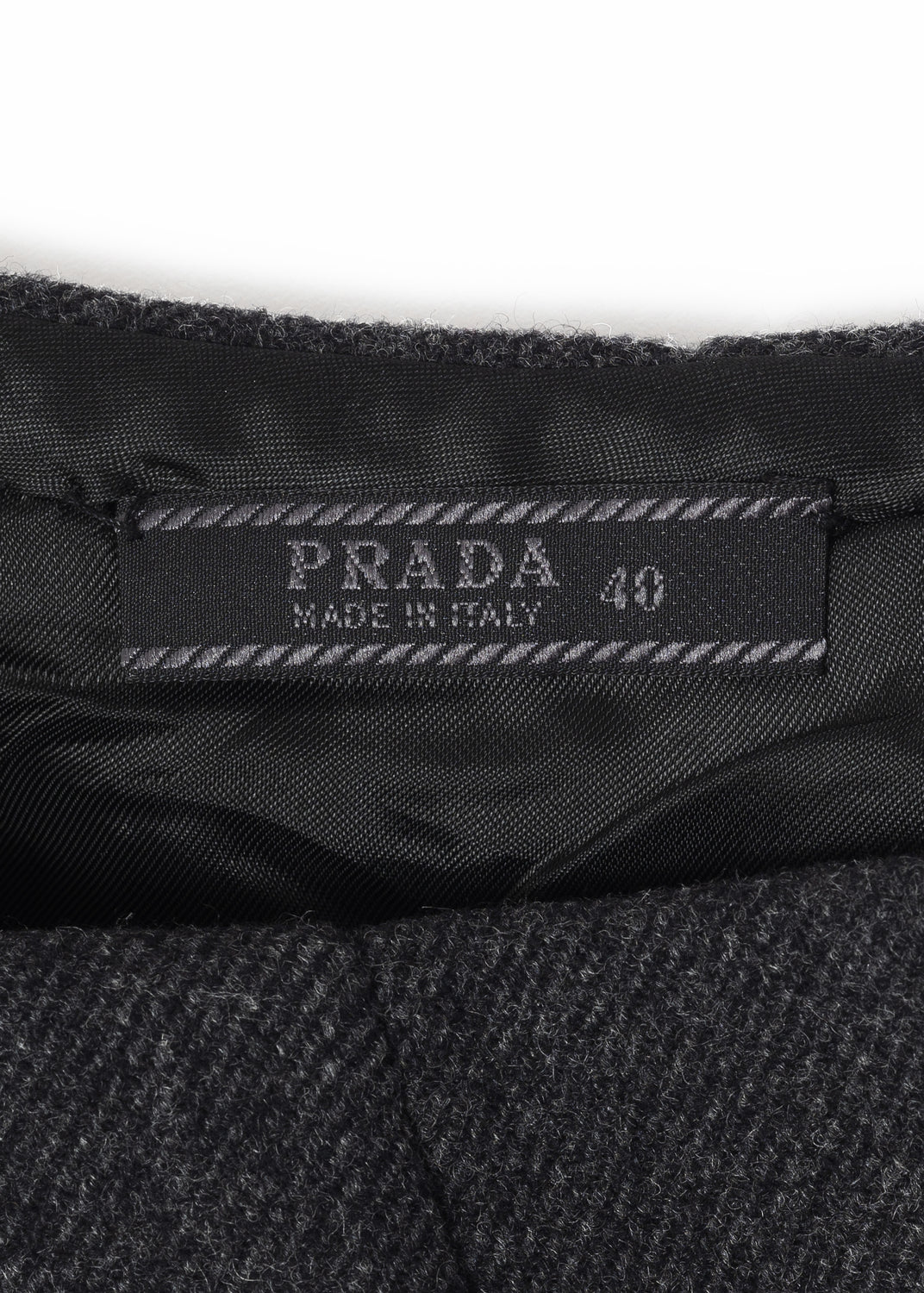 Material Wool gabardine Composition 100% Wool Handle Textured, weighty Weight Midweight Transparency No Stretch No Sheen No Lining Rayon lining Composition 100% Rayon InscriptionsLabel marked "PRADA MADE IN ITALY 40"