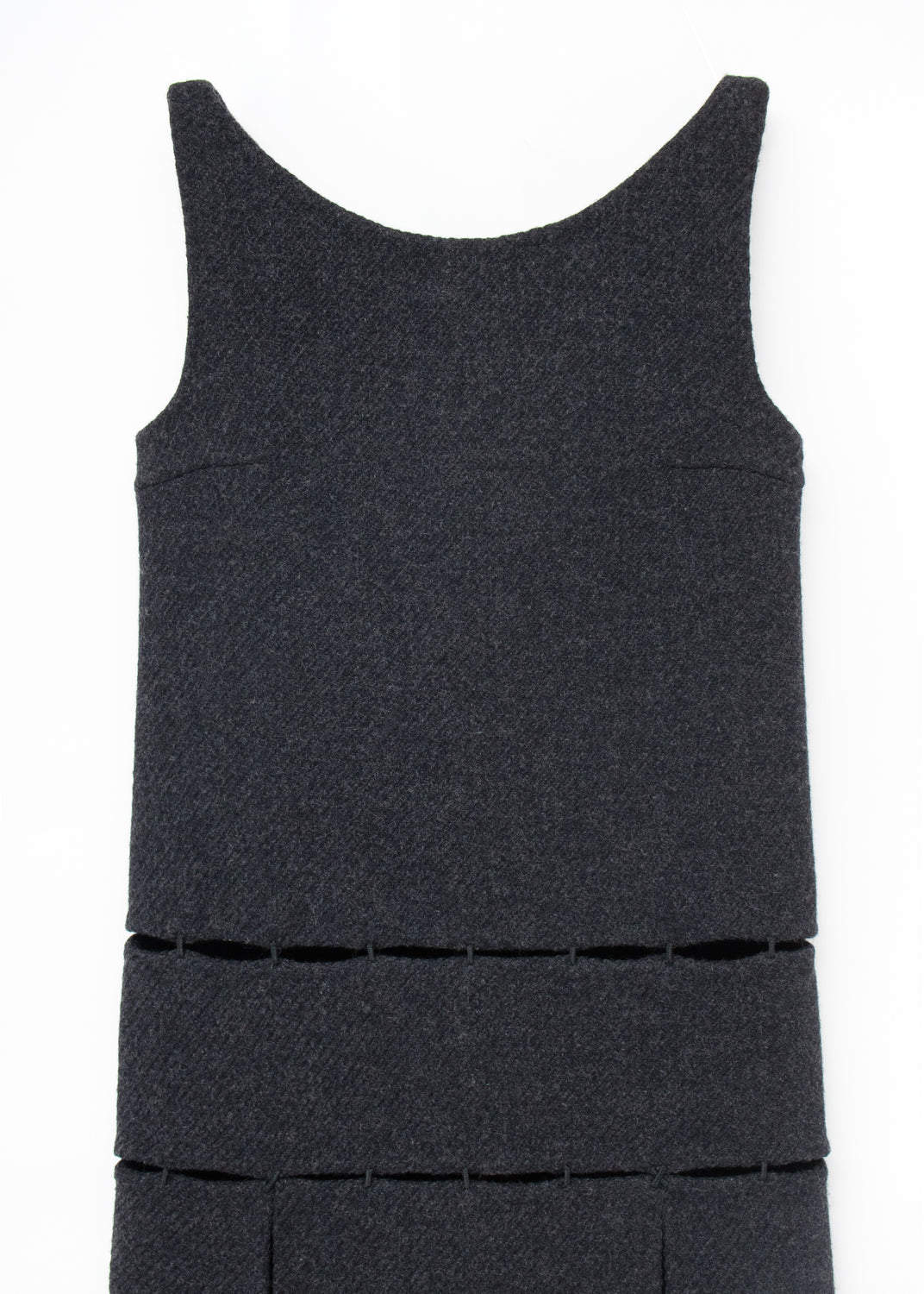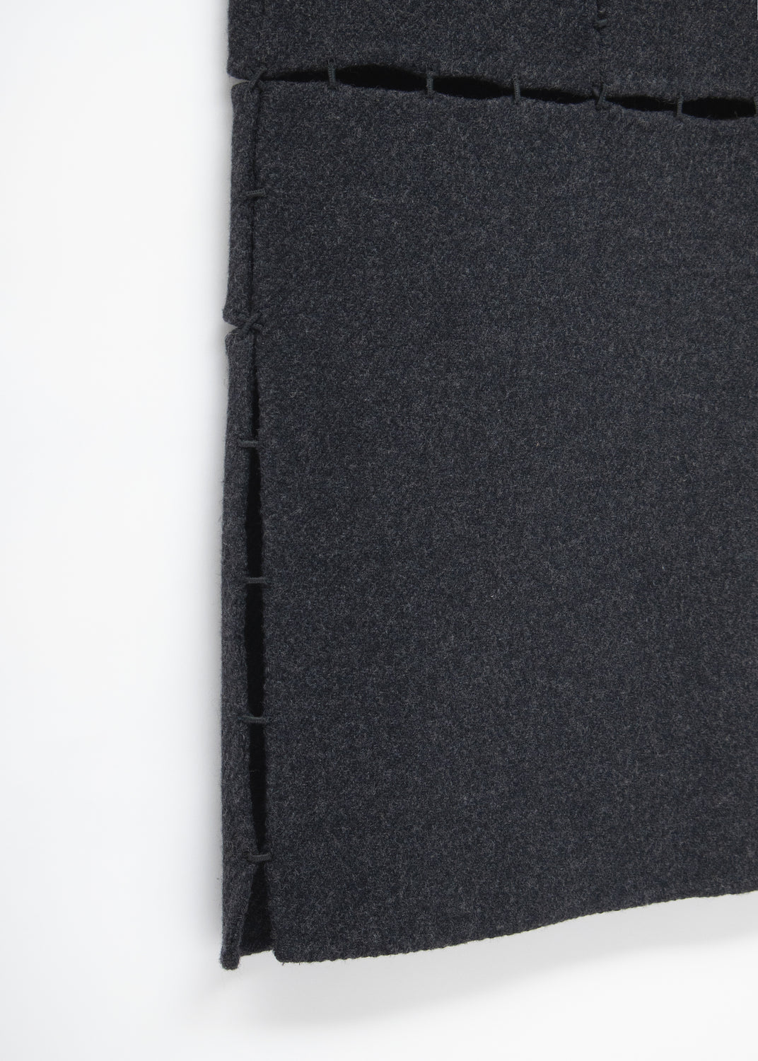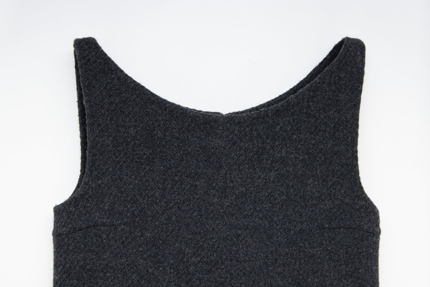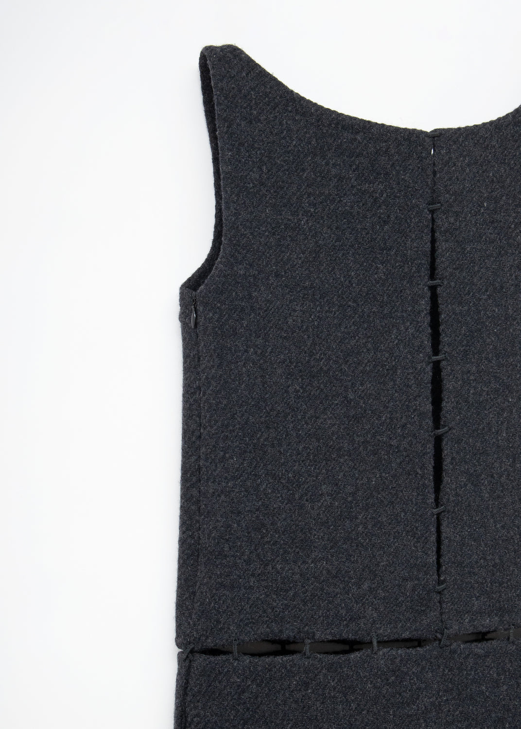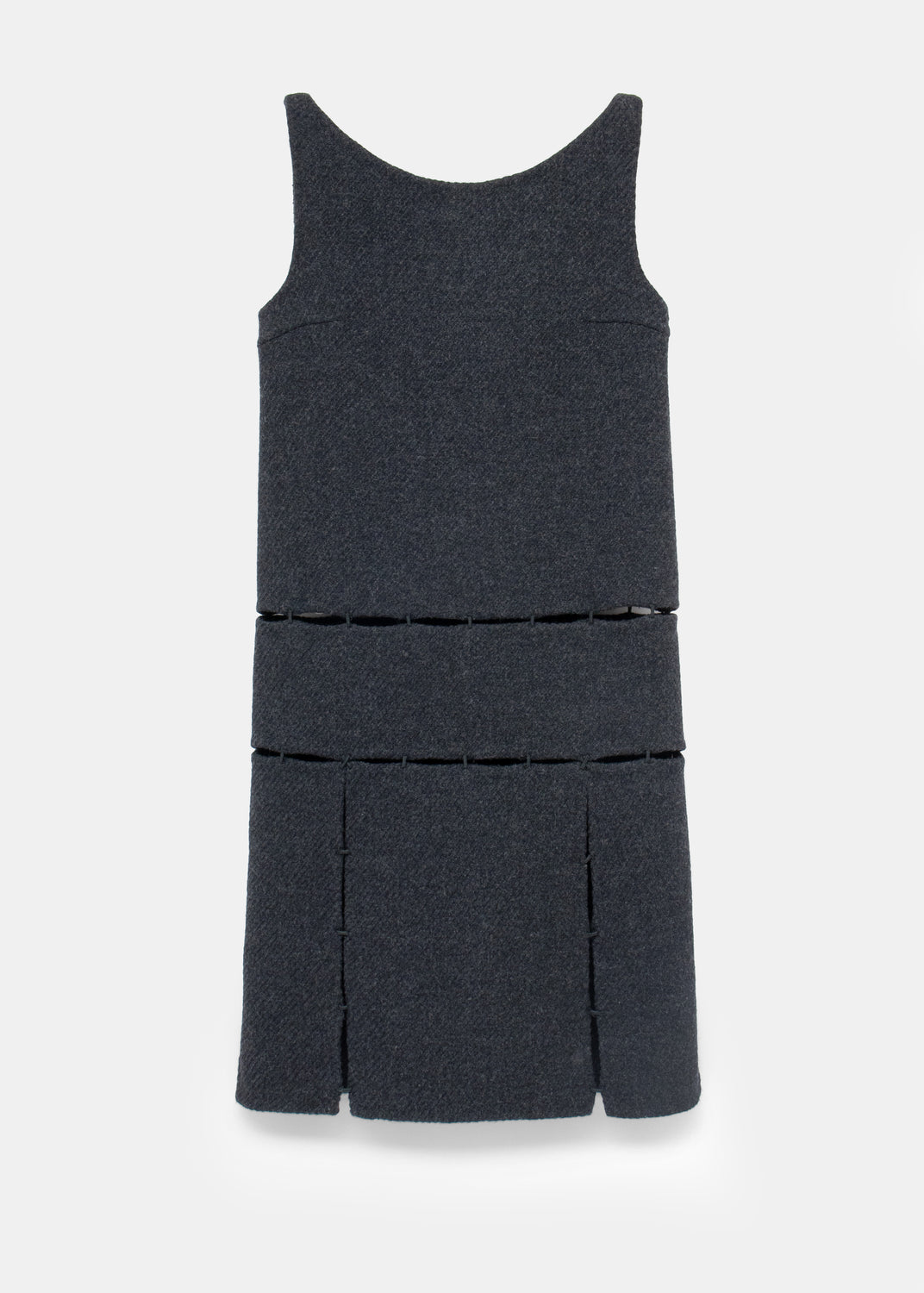 This sleeveless dress in Shetland wool was one example. A shift dress in essence, its straightforward silhouette is disrupted by those split seams, revealing hints of skin underneath.