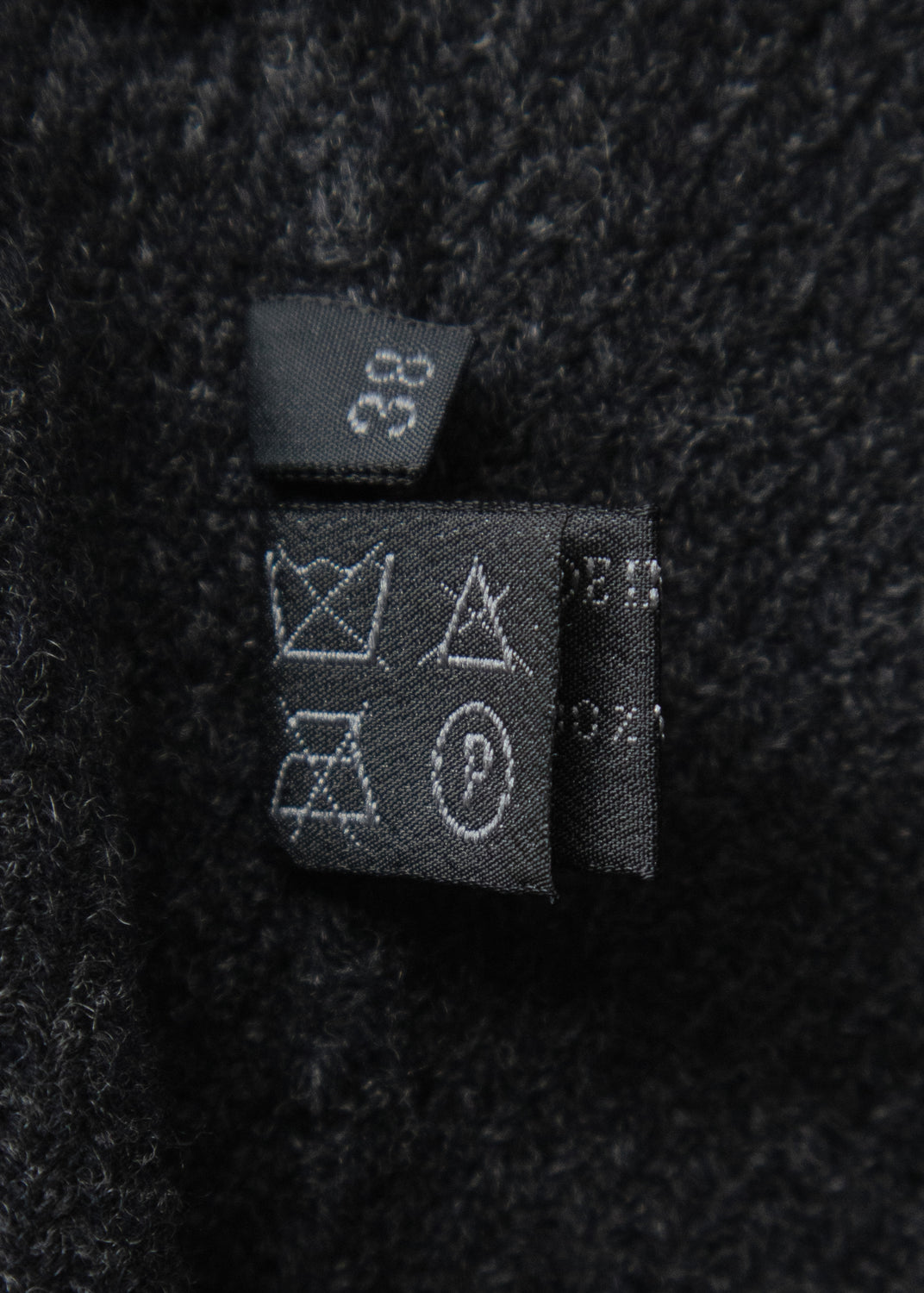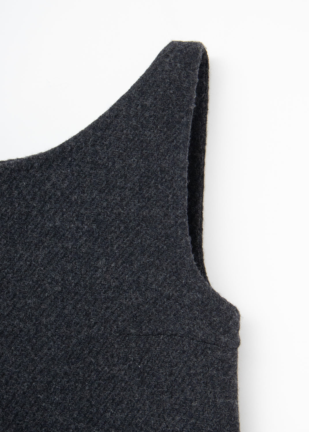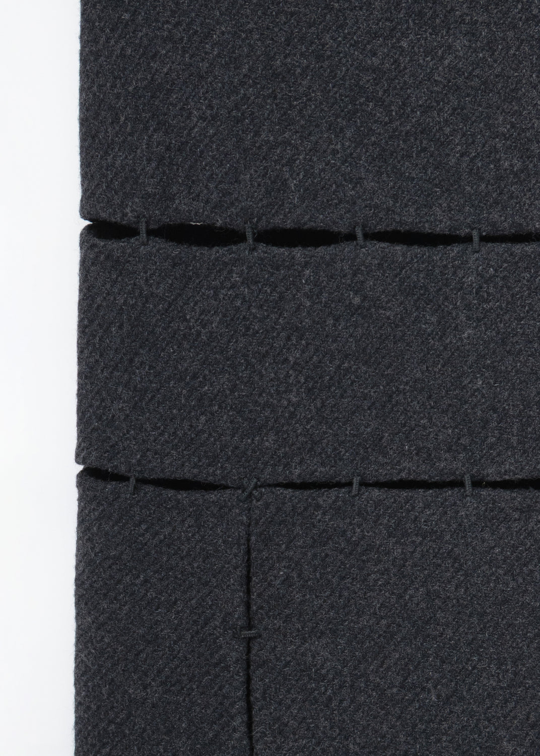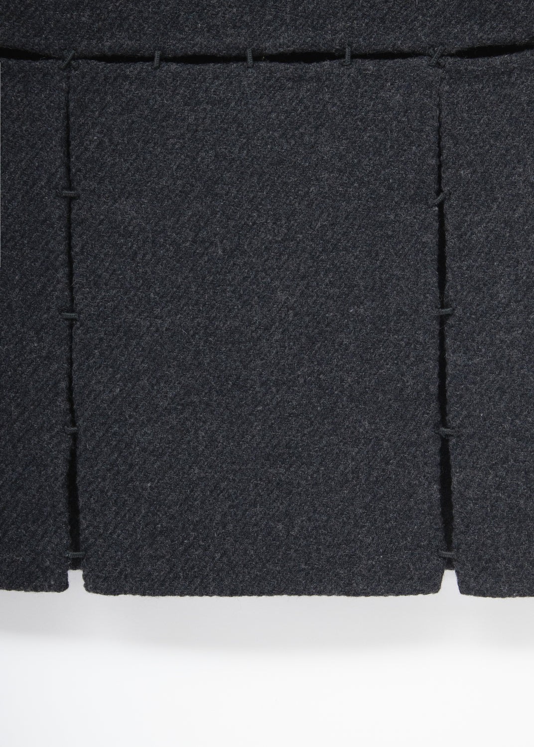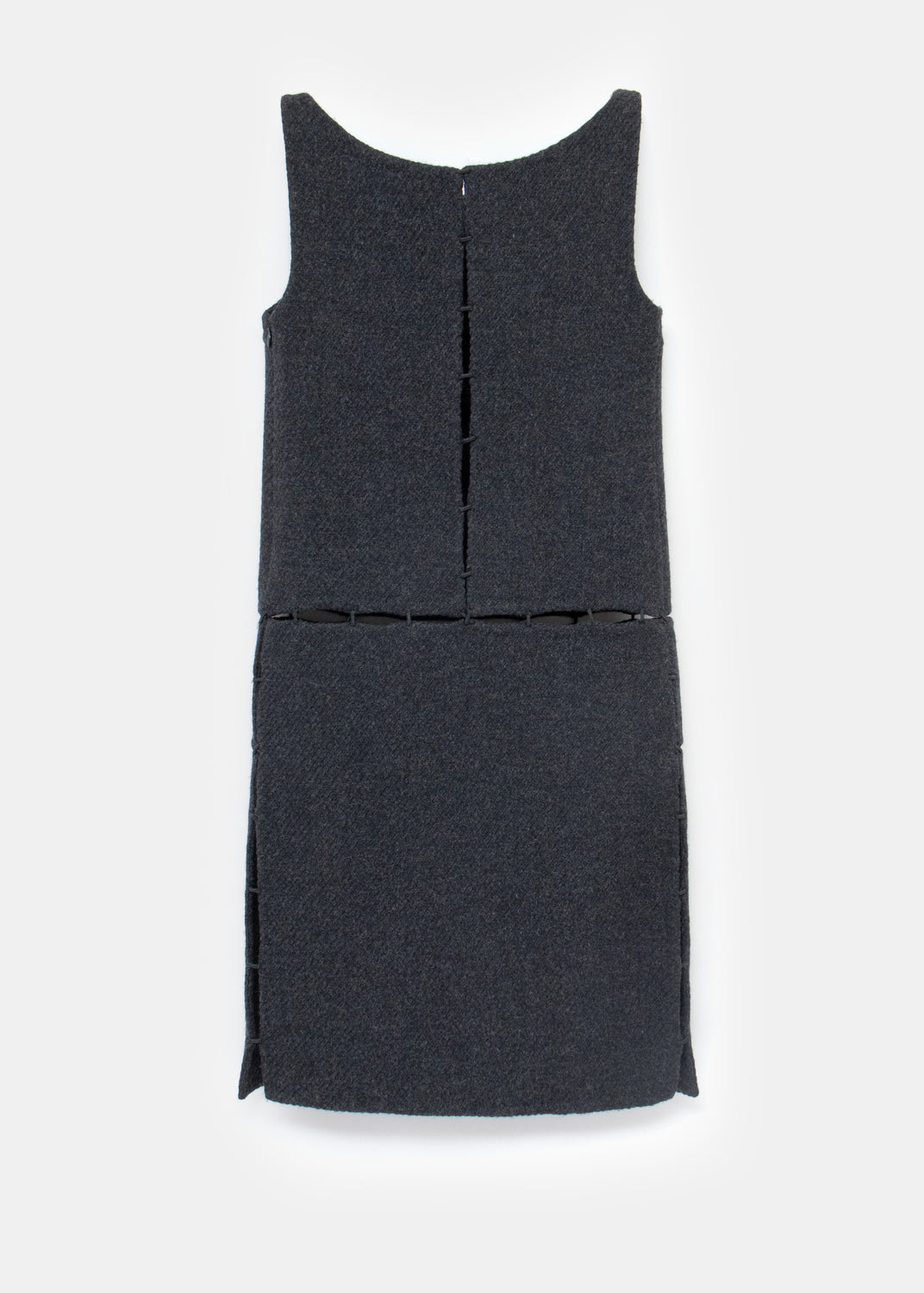 This sleeveless dress in Shetland wool was one example. A shift dress in essence, its straightforward silhouette is disrupted by those split seams, revealing hints of skin underneath.
