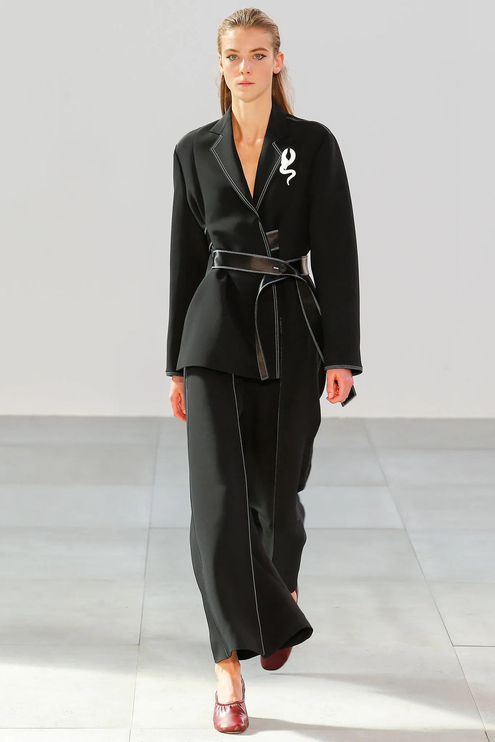 For Spring/Summer 2015, Phoebe Philo loosened her rigorous editing process and worked “open to everything”, welcoming uncertainty and ambiguity to show clothes that felt playful, more fluid, yet still pragmatic and functional. Seemingly appearing like tailored separates, this suit is actually a single garment, cut in heavy viscose crepe: substantial and weighty, yet fluid in motion.