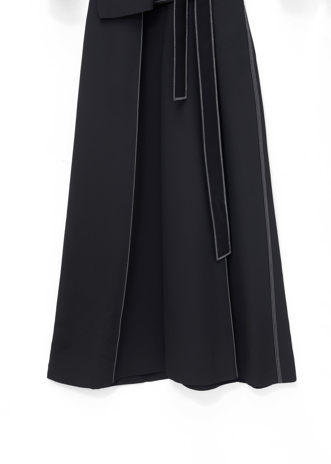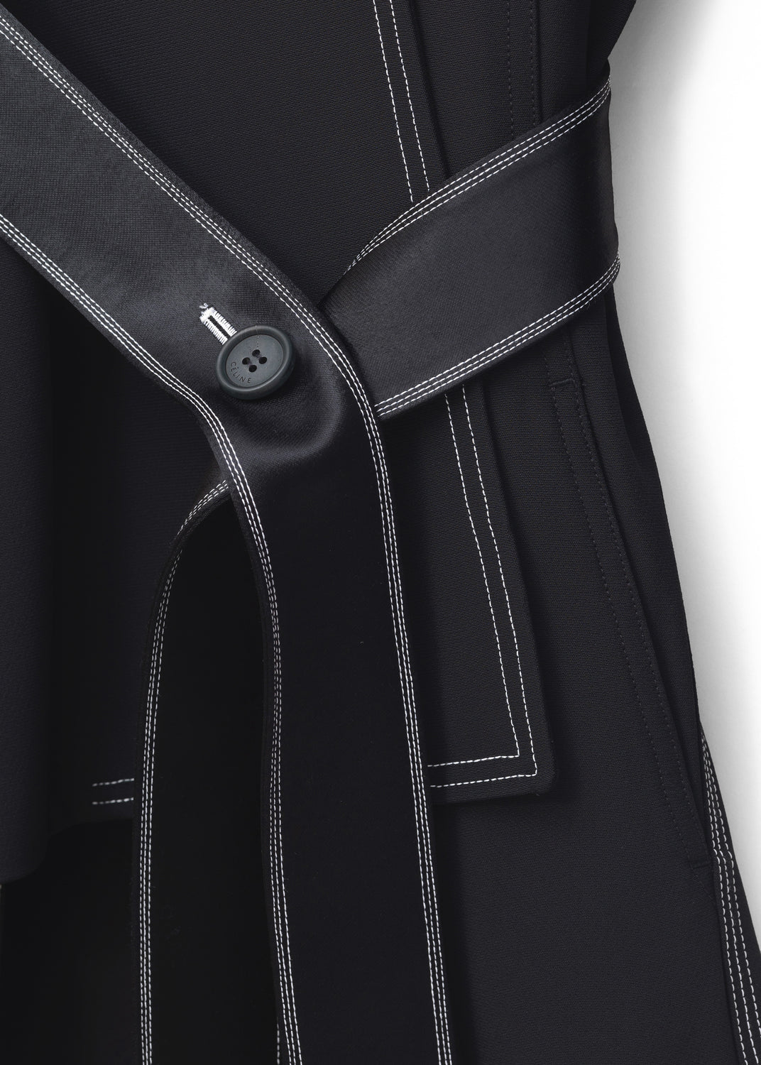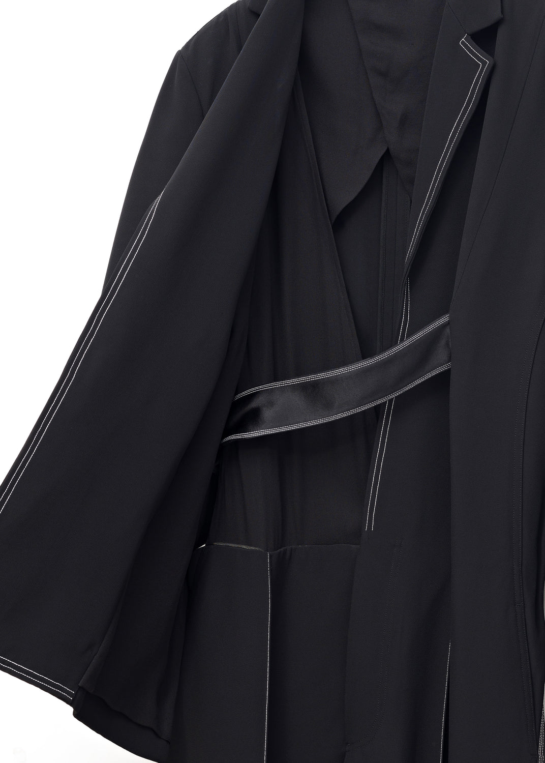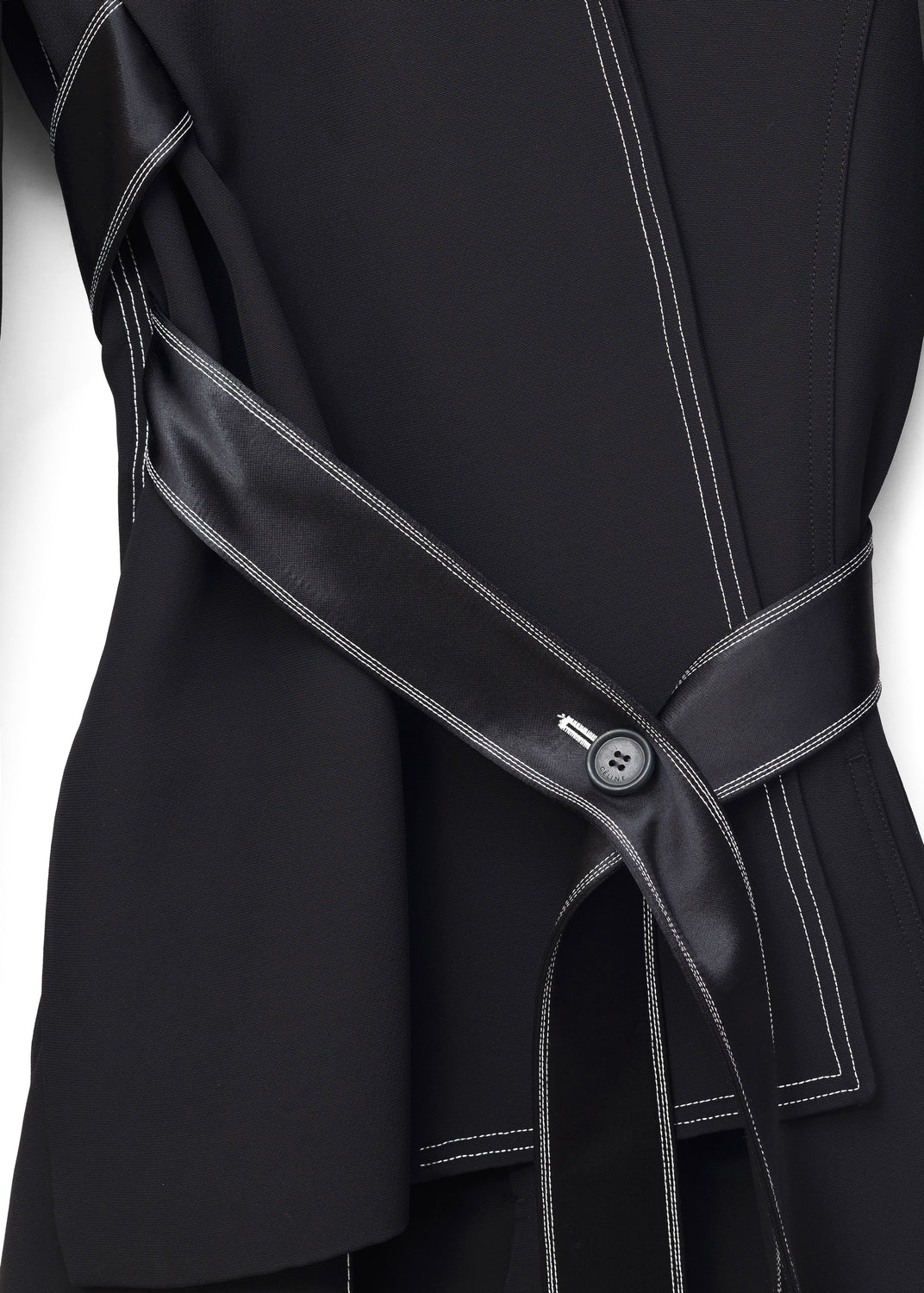 Construction and function doubles as decoration: double-satin belts thread through the jacket, wrapping around the waist to meet at the front. Cut extra long, they secure the piece while moving and flaring as you walk. White contrast-stitching throughout emphasizes the suit’s lines. Trousers are cut palazzo-style to an exaggerated flare, kicking out dramatically with movement.