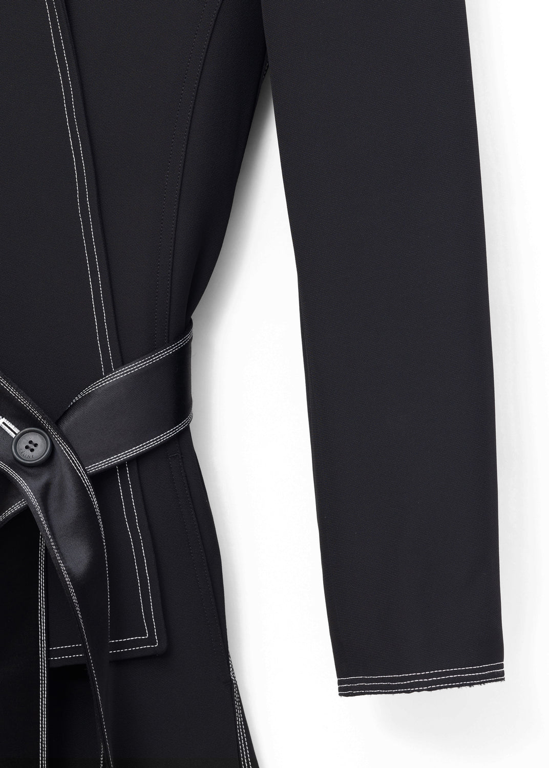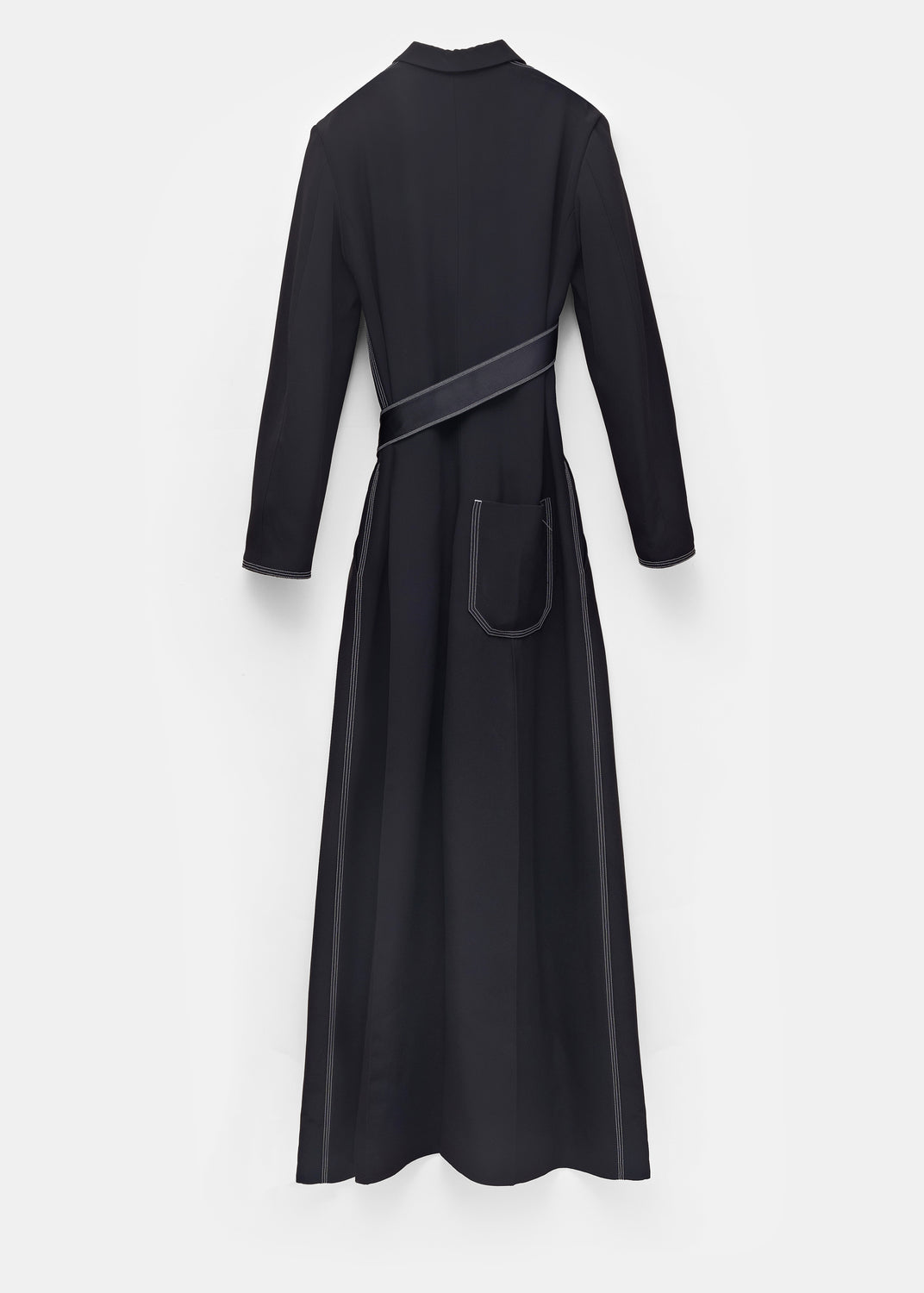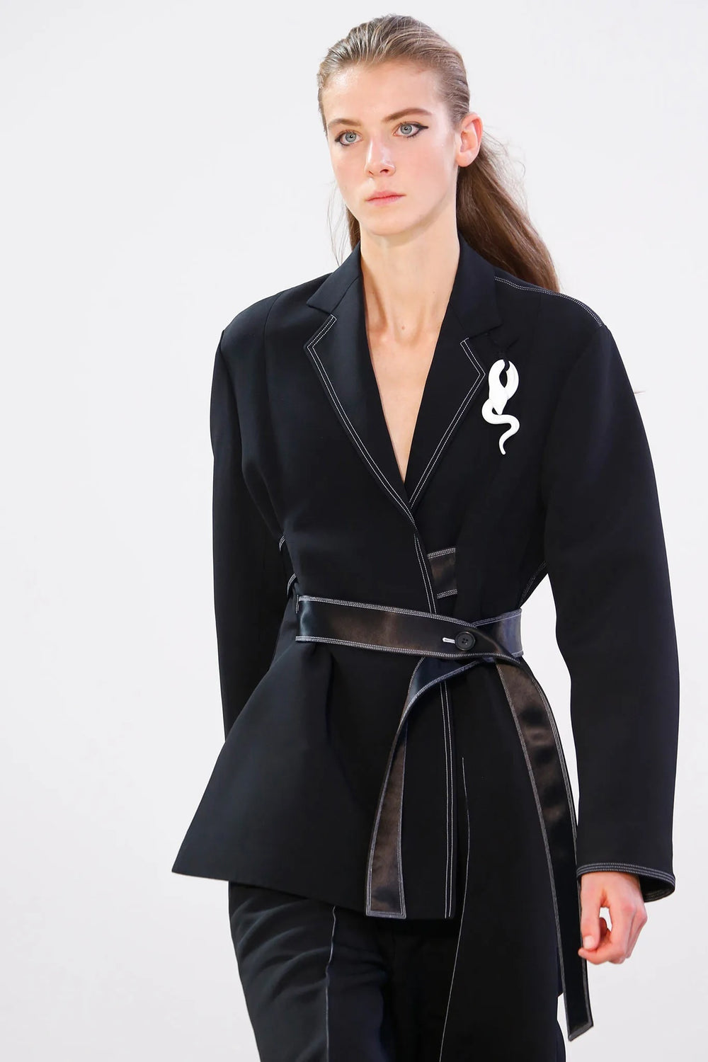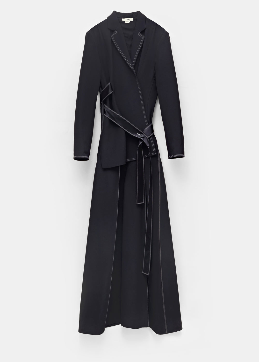 Construction and function doubles as decoration: double-satin belts thread through the jacket, wrapping around the waist to meet at the front. Cut extra long, they secure the piece while moving and flaring as you walk. White contrast-stitching throughout emphasizes the suit’s lines. Trousers are cut palazzo-style to an exaggerated flare, kicking out dramatically with movement.