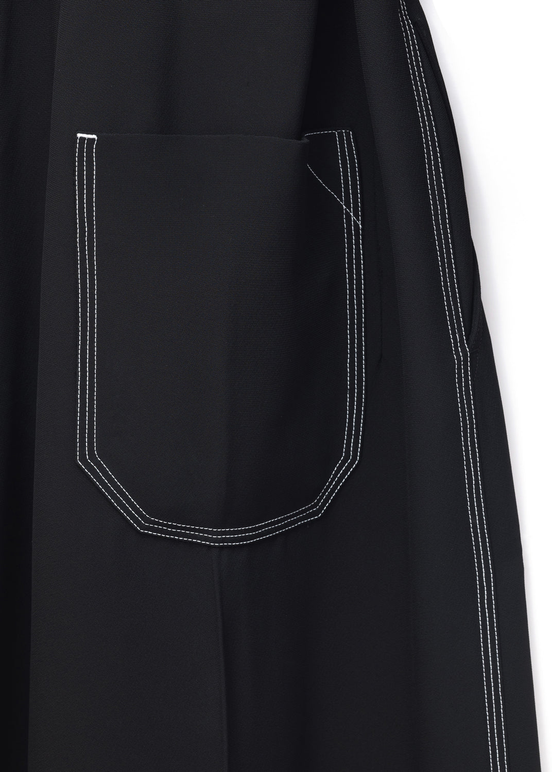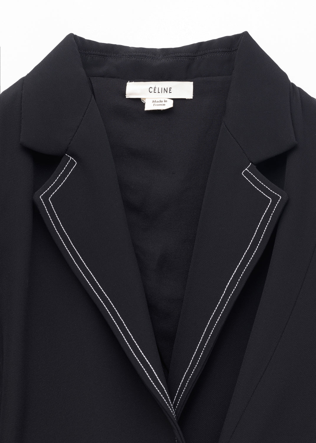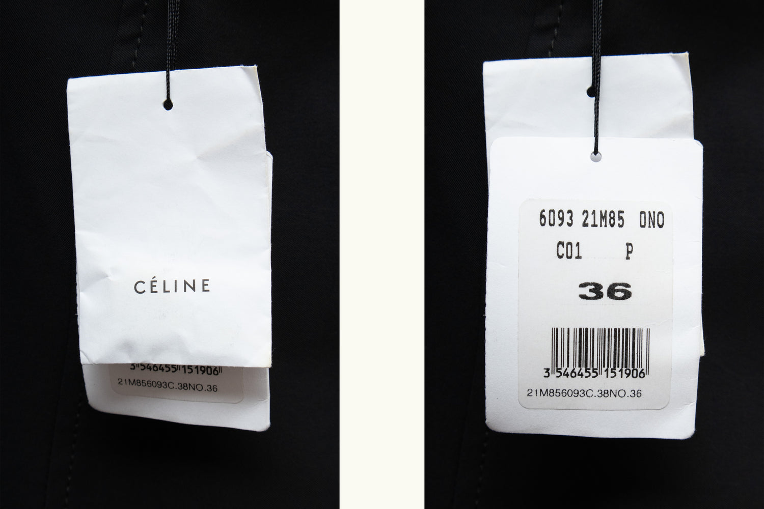 Button flyMediumMaterial Viscose-wool crepe Composition 58% Viscose, 42% Wool Handle Dry, fluid, compact, weighty Weight Heavyweight Transparency No Stretch No Sheen No Belts Double satin Composition 100% Viscose Lining Silk georgette Composition 100% Silk InscriptionsLabel marked "CÉLINE"