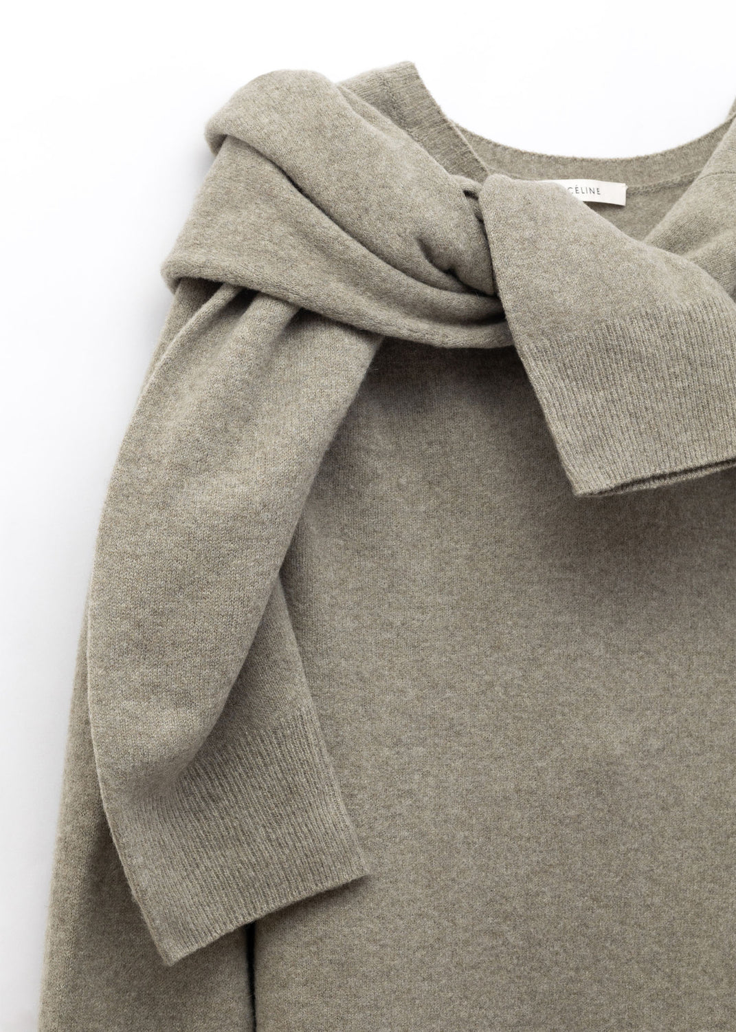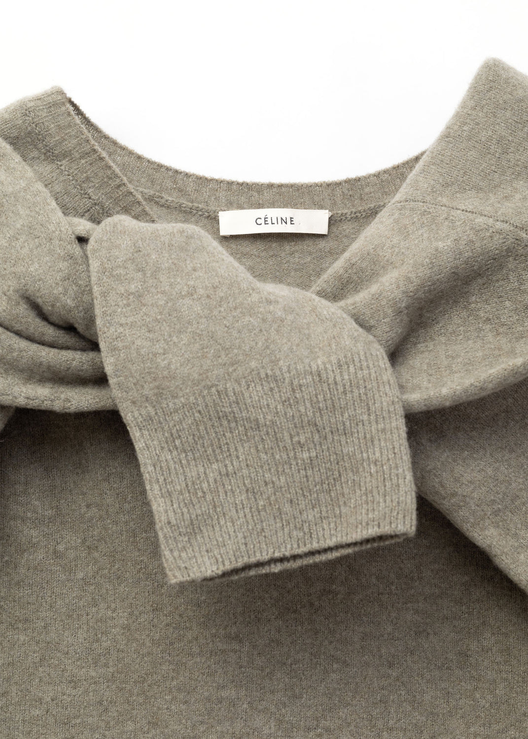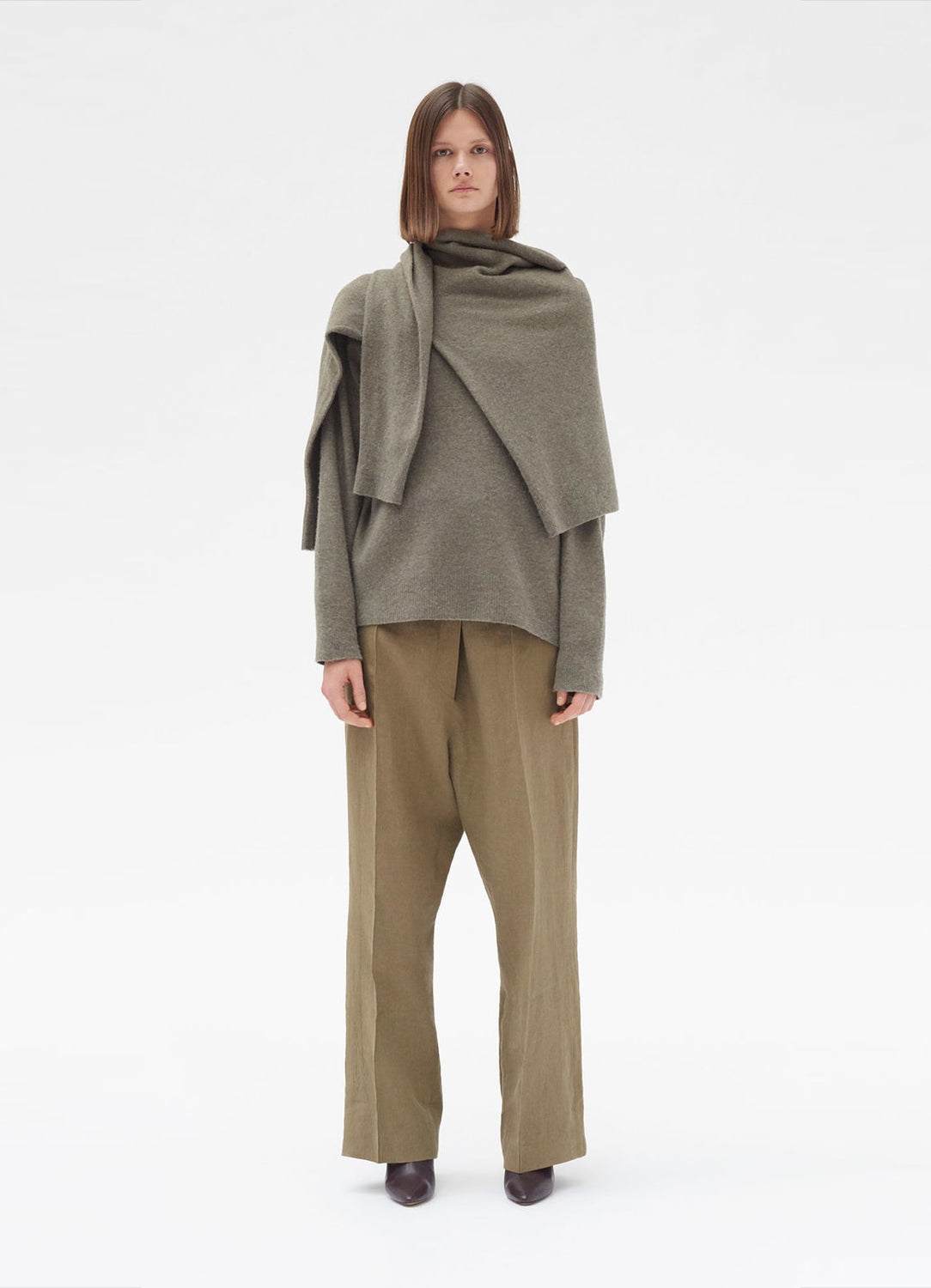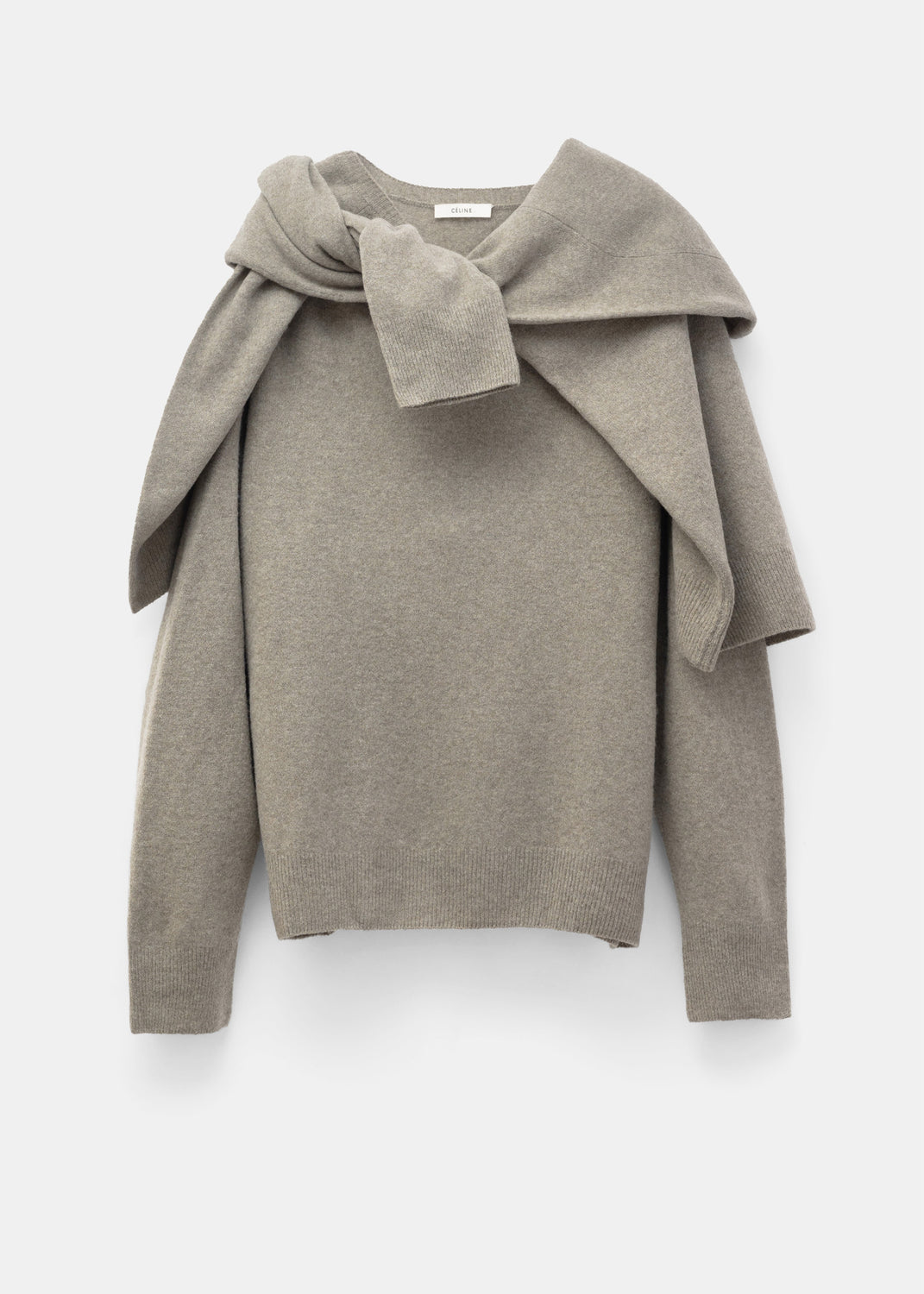 In her final collection for Céline, Phoebe Philo offered playful interpretations of knitwear. This piece, in boiled khaki-gray wool, explores the familiar ways we wear sweaters: tied over the shoulders or simply pulled on.