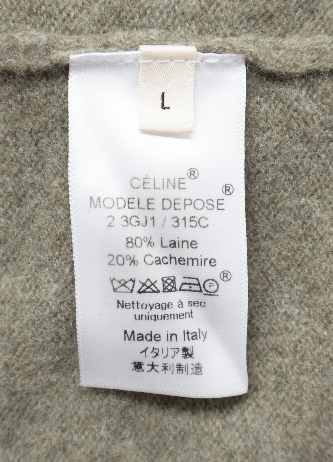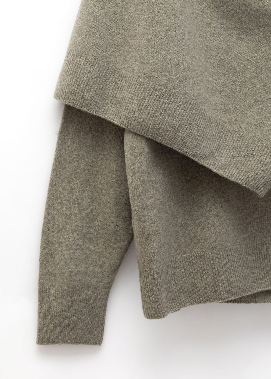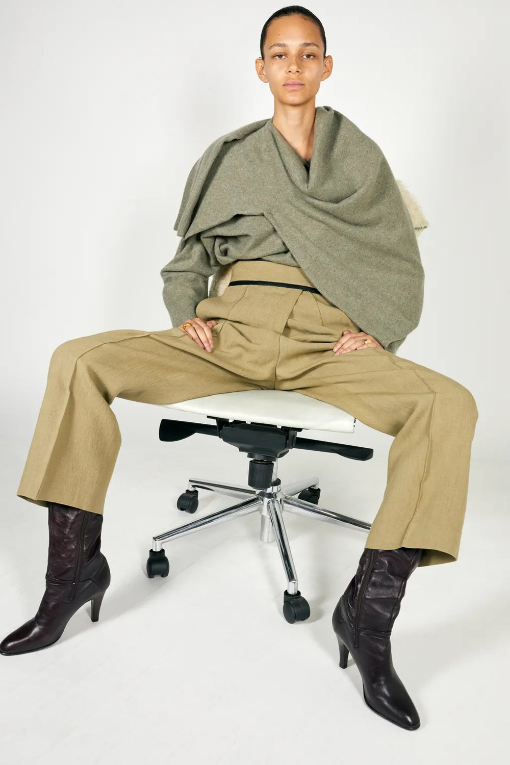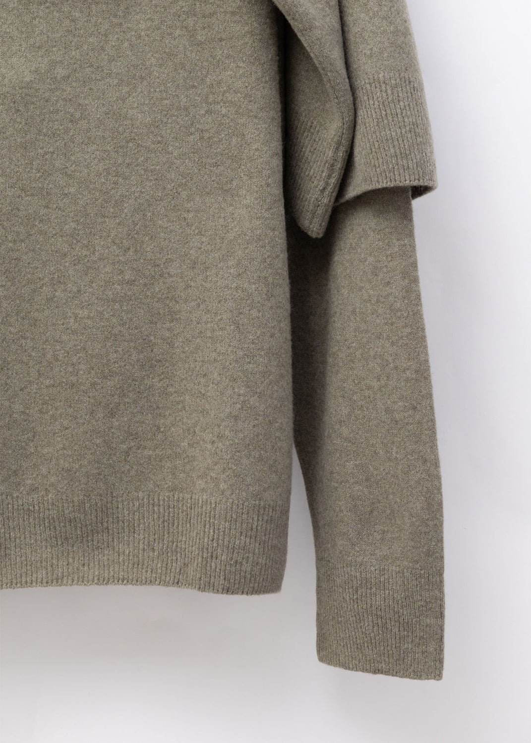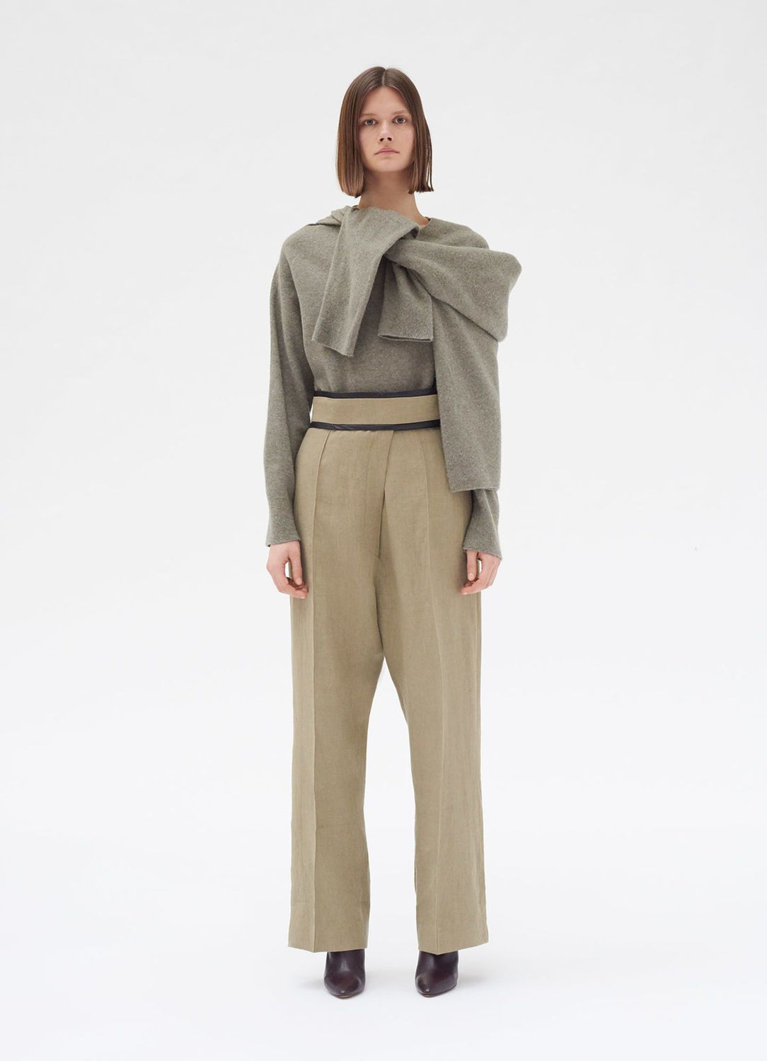 In her final collection for Céline, Phoebe Philo offered playful interpretations of knitwear. This piece, in boiled khaki-gray wool, explores the familiar ways we wear sweaters: tied over the shoulders or simply pulled on.