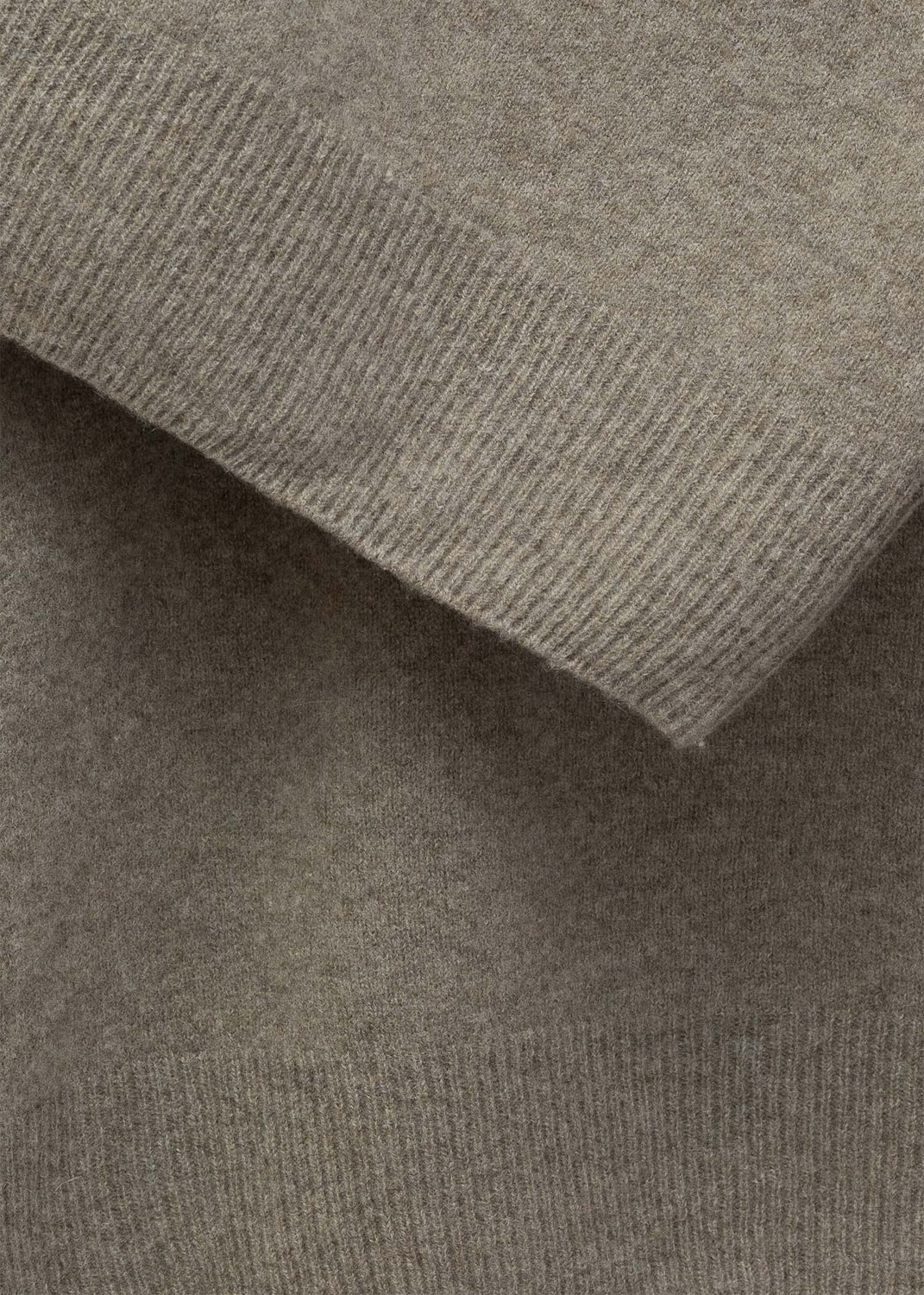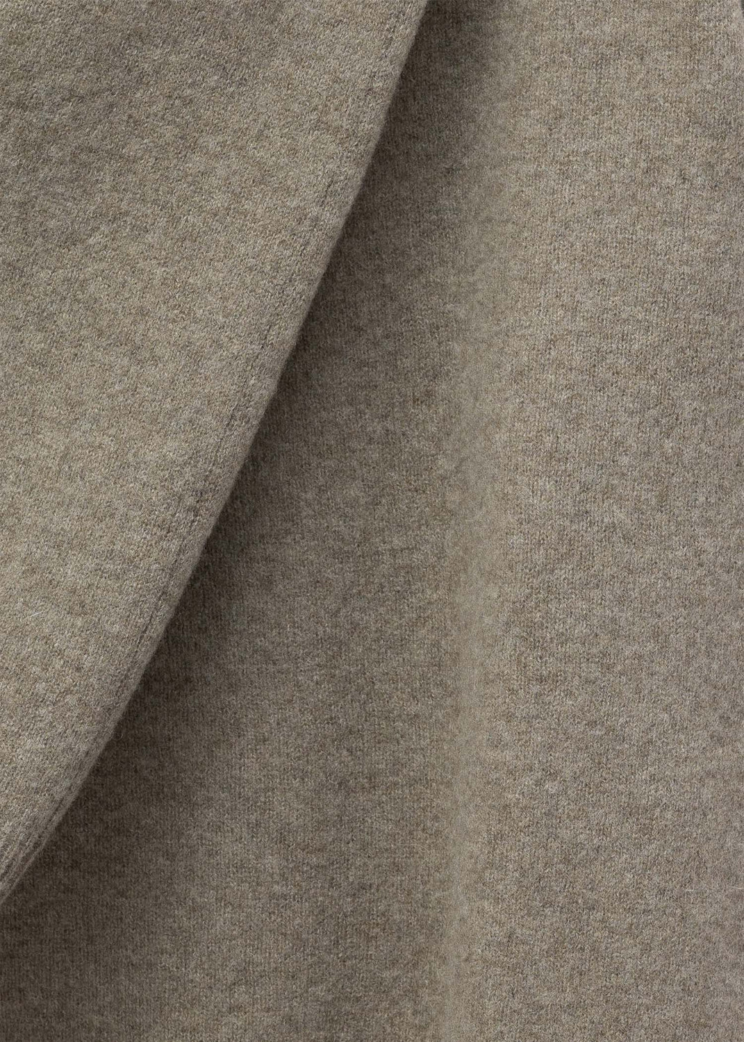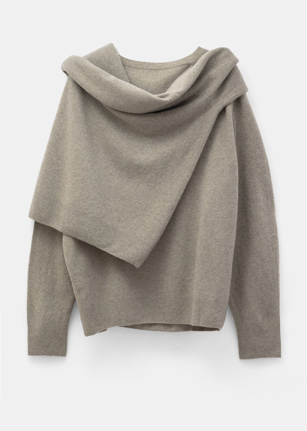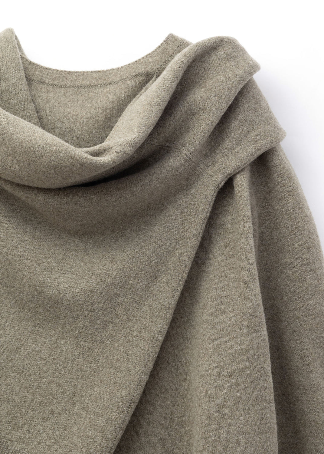 In her final collection for Céline, Phoebe Philo offered playful interpretations of knitwear. This piece, in boiled khaki-gray wool, explores the familiar ways we wear sweaters: tied over the shoulders or simply pulled on.