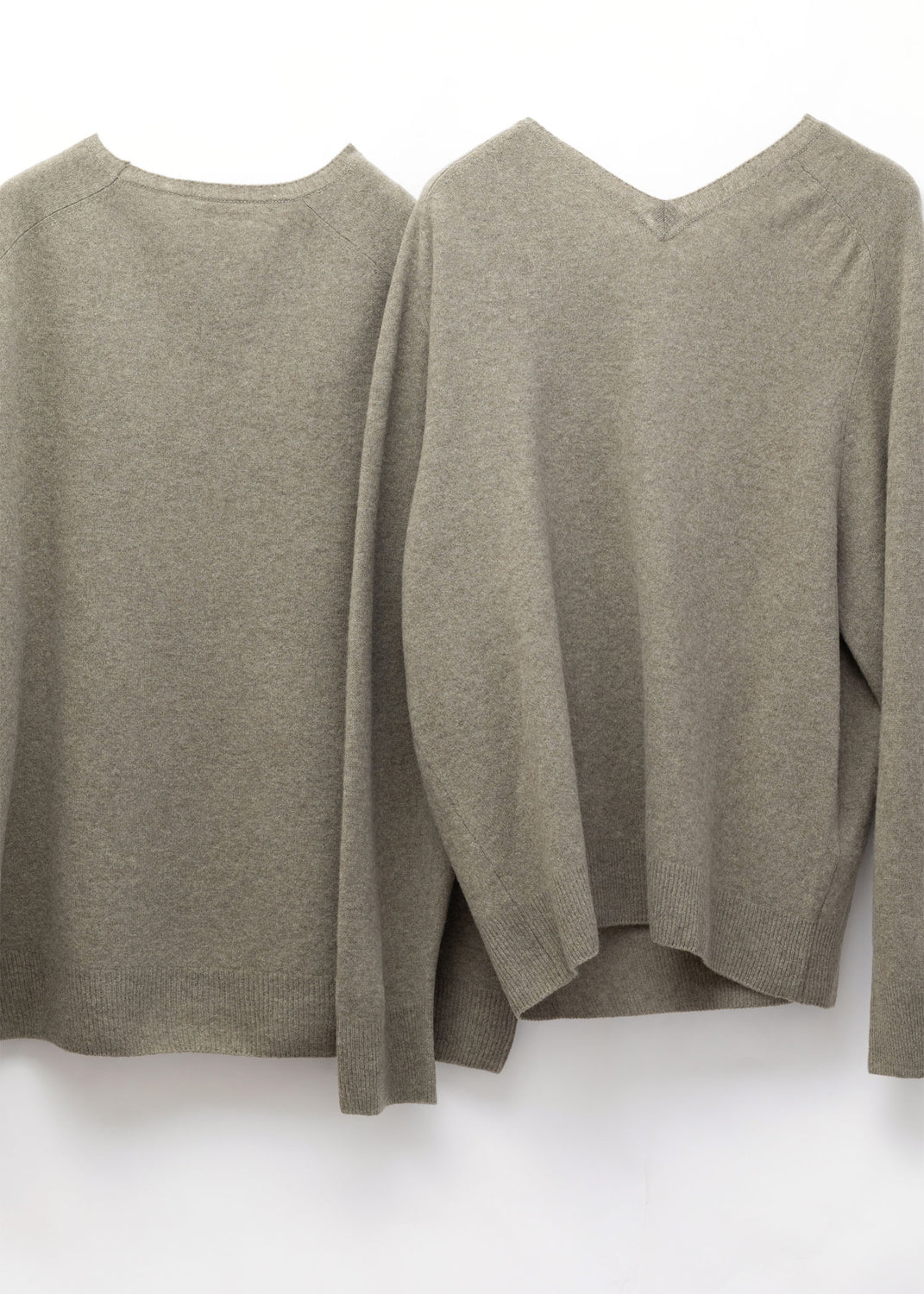 The crew-neck's sleeve is joined to the v-neck's shoulder