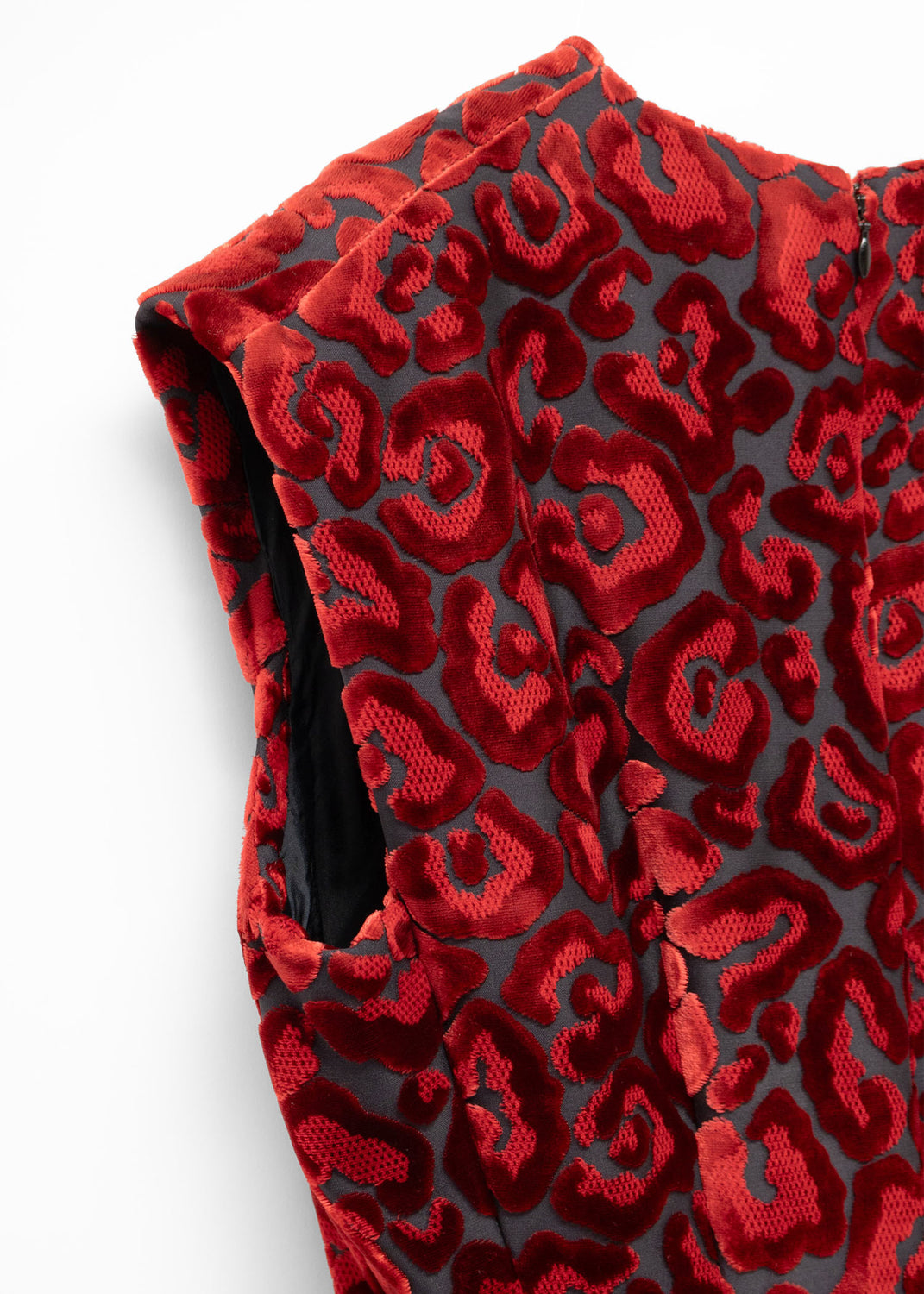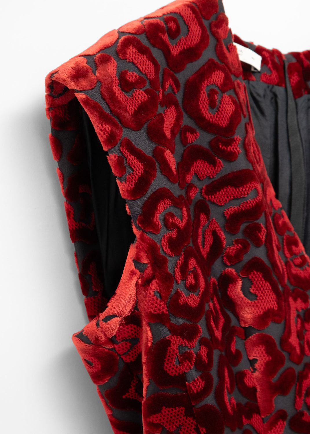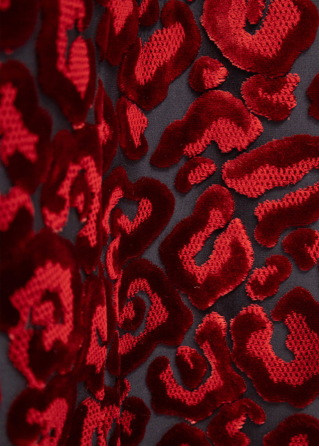 Material Rosette-motif velvet jacquard Composition 54% Silk, 46% Viscose Handle Soft, fuzzy, thick, weighty Weight Midweight Transparency No Stretch No Sheen No Lining Polyester lining Composition 100% Polyester InscriptionsLabel marked "PRADA Made in Italy 40"